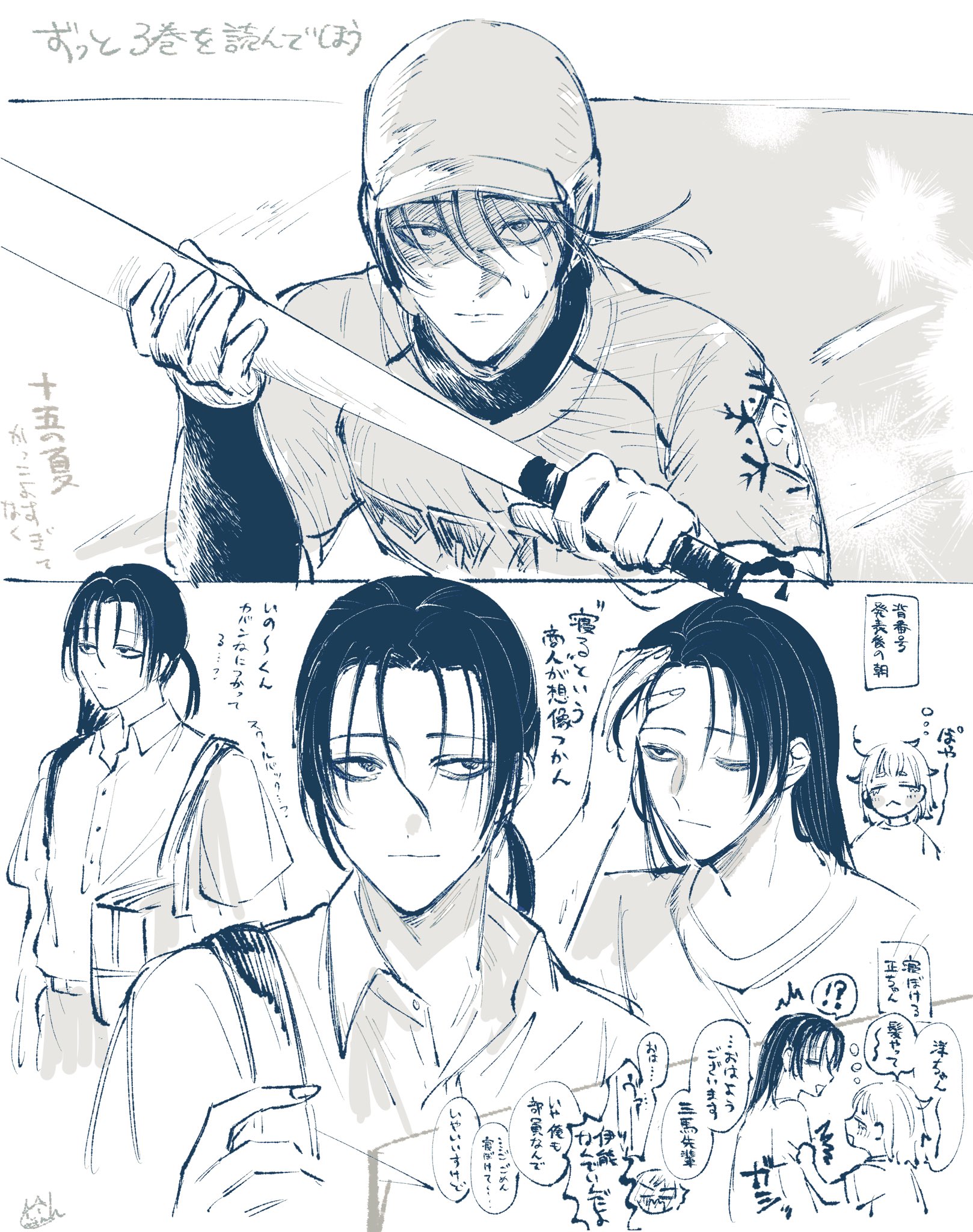 2boys :< :| asumi_chikyuu bag baseball baseball_bat baseball_helmet baseball_jersey baseball_uniform closed_mouth collared_shirt commentary_request dress_shirt hair_down hand_on_own_head height_difference helmet highres holding holding_baseball_bat ino_akindo jersey long_hair looking_to_the_side male_focus mima_shoma monochrome multiple_boys multiple_views one_eye_closed parted_bangs ponytail school_bag shirt short_sleeves shoulder_bag speech_bubble sportswear squeans sankyuu_pitch translation_request