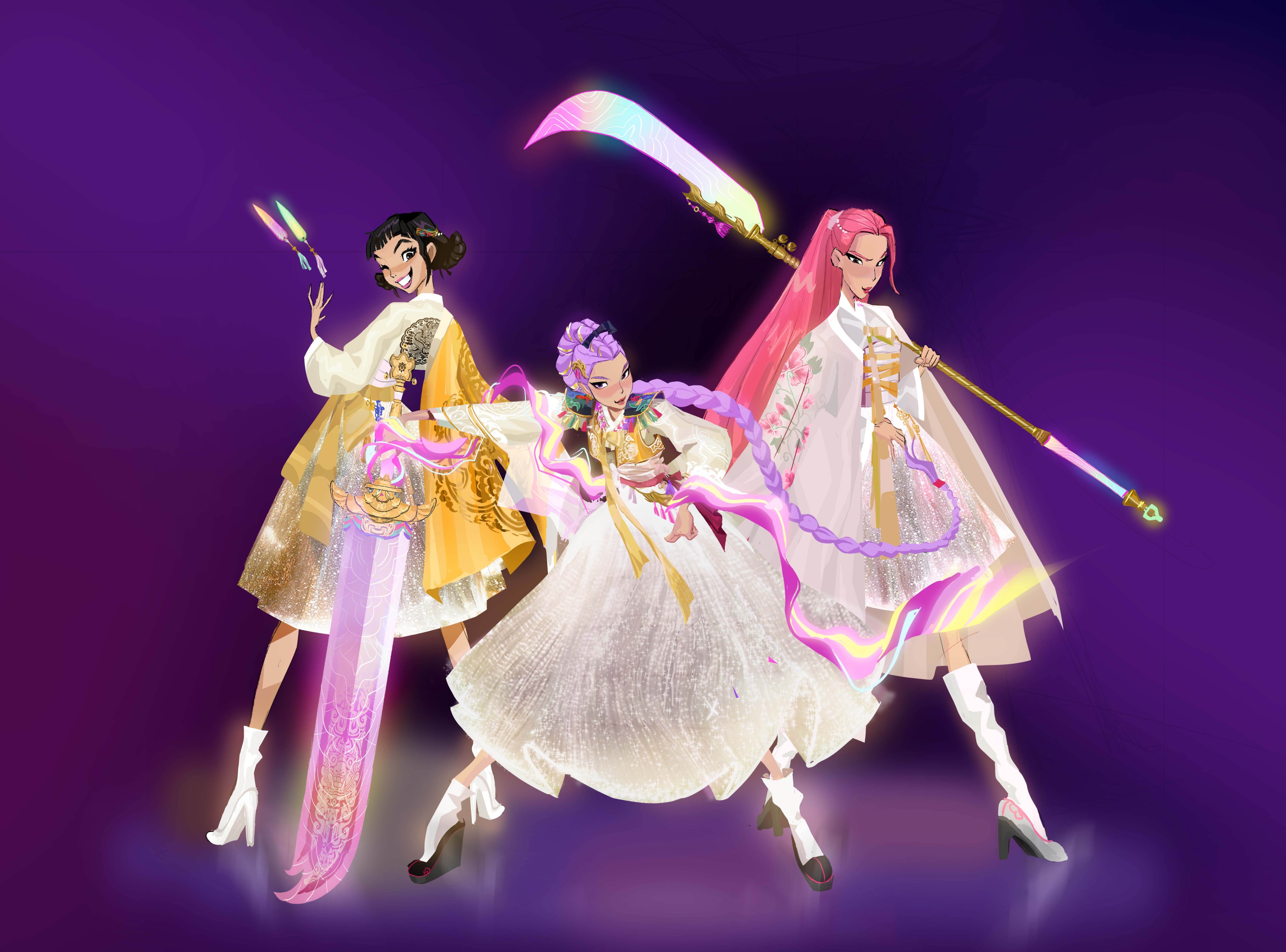 3girls absurdres black_hair boots braid braided_ponytail commentary english_commentary full_body hanbok high_heel_boots high_heels highres holding holding_polearm holding_sword holding_weapon joune5064 korean_clothes kpop_demon_hunters long_hair mira_(kpop_demon_hunters) multiple_girls pink_hair polearm purple_hair rumi_(kpop_demon_hunters) sash skirt smile sword weapon white_boots zoey_(kpop_demon_hunters)