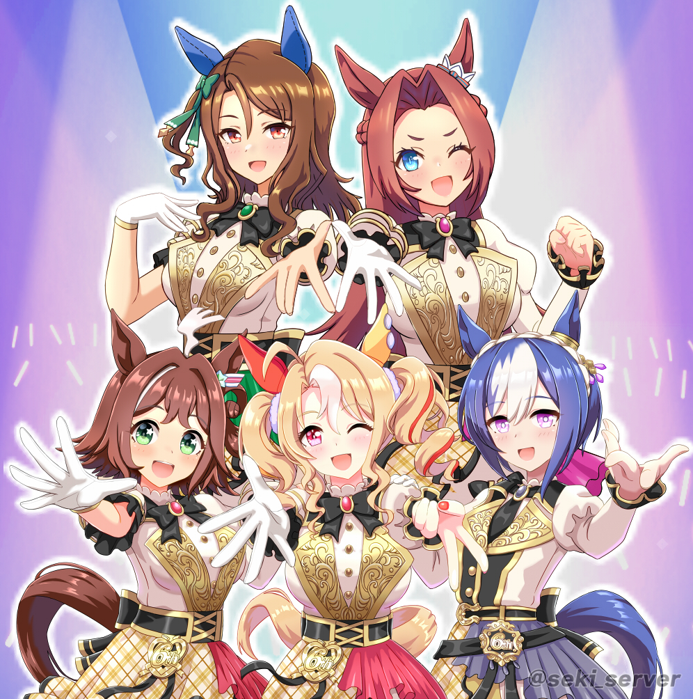 5girls animal_ears blonde_hair blue_eyes brown_hair cesario_(umamusume) ear_covers fusaichi_pandora_(umamusume) gloves green_eyes horse_ears horse_girl horse_tail kawakami_princess_(umamusume) king_halo_(umamusume) long_hair looking_at_viewer medium_hair multiple_girls open_mouth purple_eyes red_eyes rhein_kraft_(umamusume) seki_(hyokosho) short_hair smile tail umamusume white_gloves