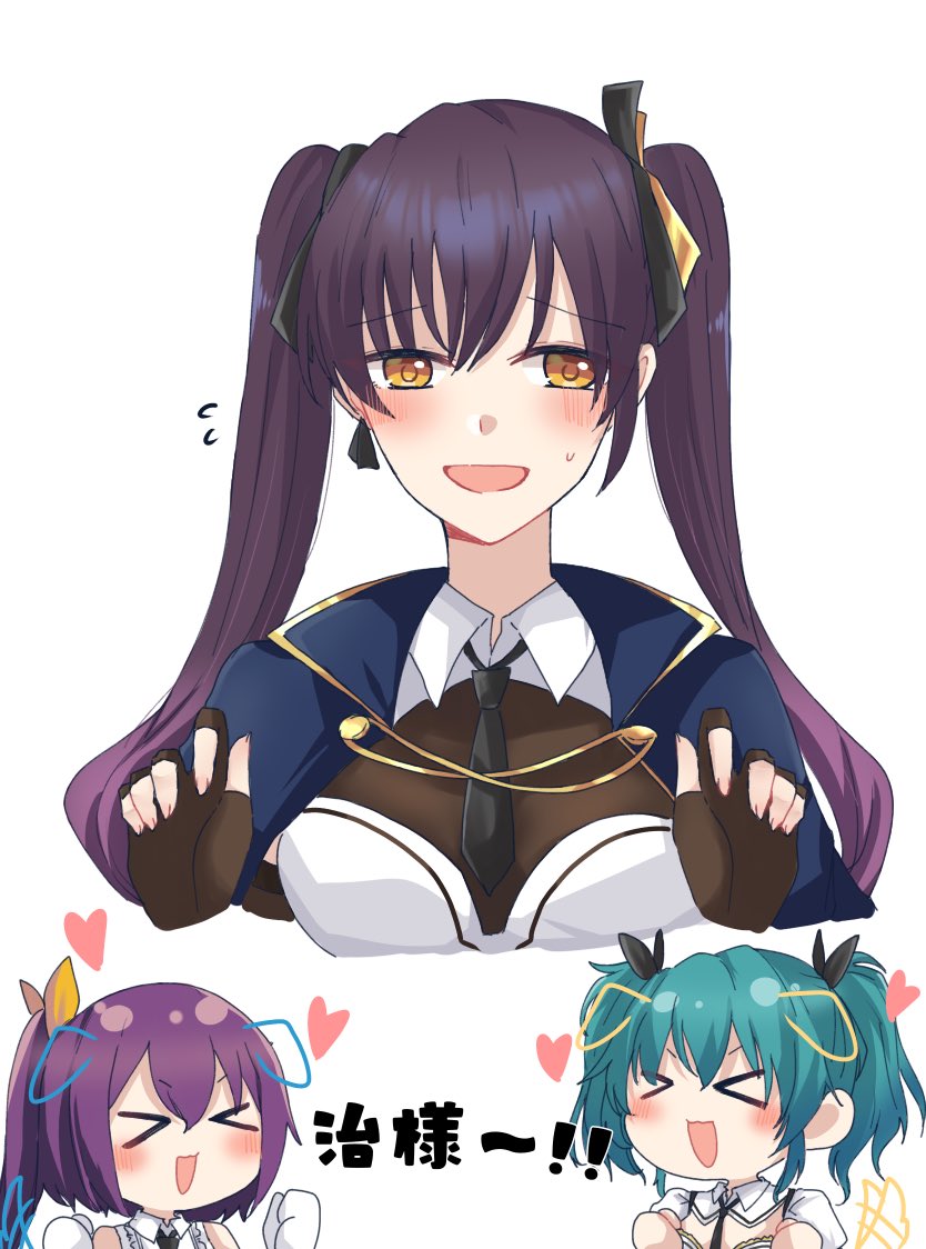 >_< 3girls :3 :d animal_ears aqua_hair assault_lily black_necktie black_ribbon blue_cloak blush breasts brown_gloves chibi chibi_inset clenched_hands cloak closed_eyes collared_shirt commentary cropped_arms cropped_torso dog_ears dog_tail drawn_ears drawn_tail earrings elbow_gloves fingerless_gloves flying_sweatdrops frilled_shirt_collar frills gloves hair_between_eyes hair_ribbon hands_up heart high_side_ponytail hishida_haru jewelry kawanabe_nazuna long_hair looking_at_viewer medium_breasts medium_hair multiple_girls necktie nigari_(ngari_0115) odaiba_girls_high_school_uniform open_mouth purple_hair raised_eyebrows ribbon school_uniform shirt short_necktie side_ponytail simple_background single_earring sleeveless sleeveless_shirt smile suzuki_chinami sweatdrop tail tail_wagging translated twintails upper_body v-shaped_eyebrows white_background white_gloves white_shirt yellow_eyes yellow_ribbon