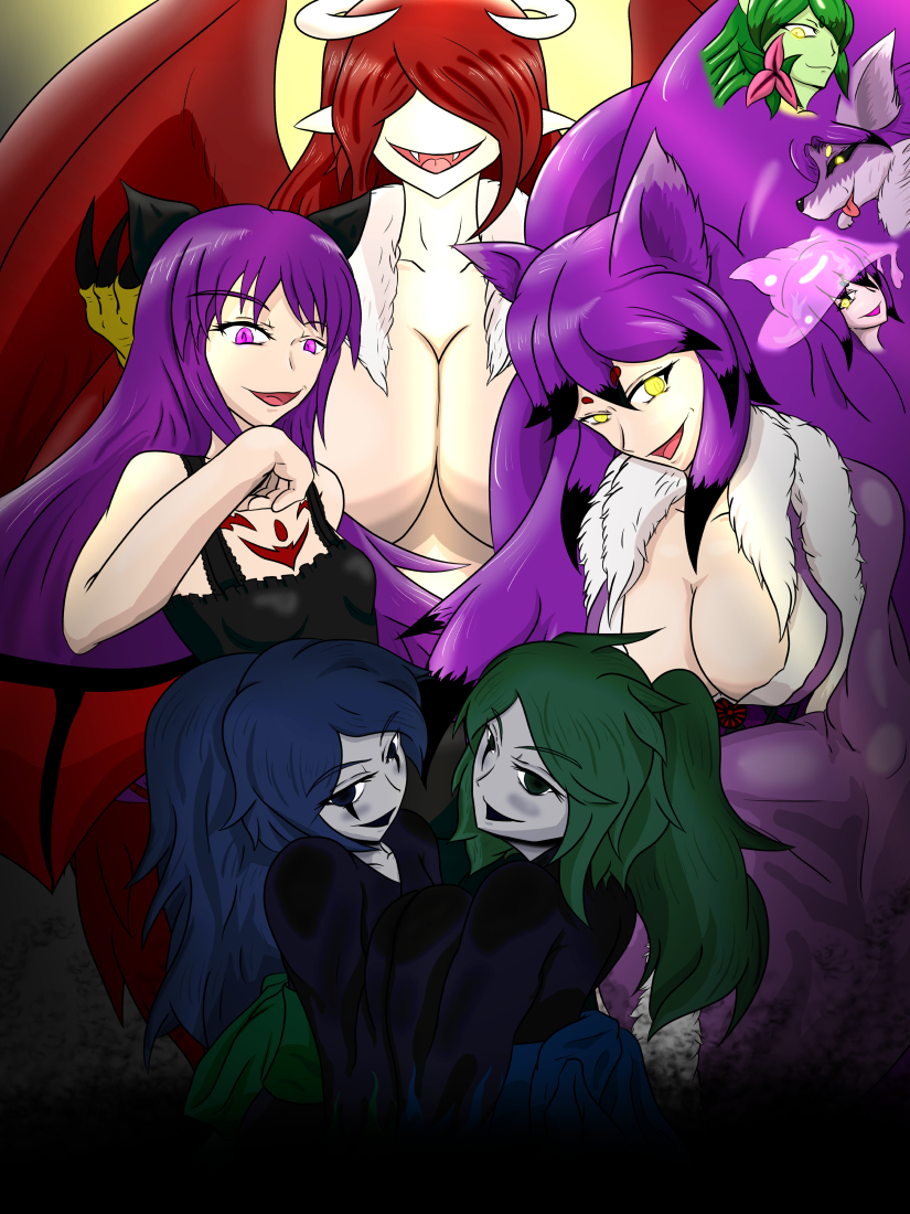abaddon_(shrift) asukakurehito black_eyes blue_eyes blue_hair breasts chest_tattoo colored_skin daji_(mon-musu_quest!) daji_(shrift) demon_girl demon_horns fangs fangs_out green_eyes green_hair grin harpy harpy_queen_(shrift) hecate_(shrift) horns kitsune kyuubi large_breasts mon-musu_quest! mon-musu_quest:_paradox monster_girl multiple_girls multiple_tails pointy_ears purple_eyes purple_fur purple_hair shrift small_breasts smile tail tattoo white_skin wings yellow_eyes