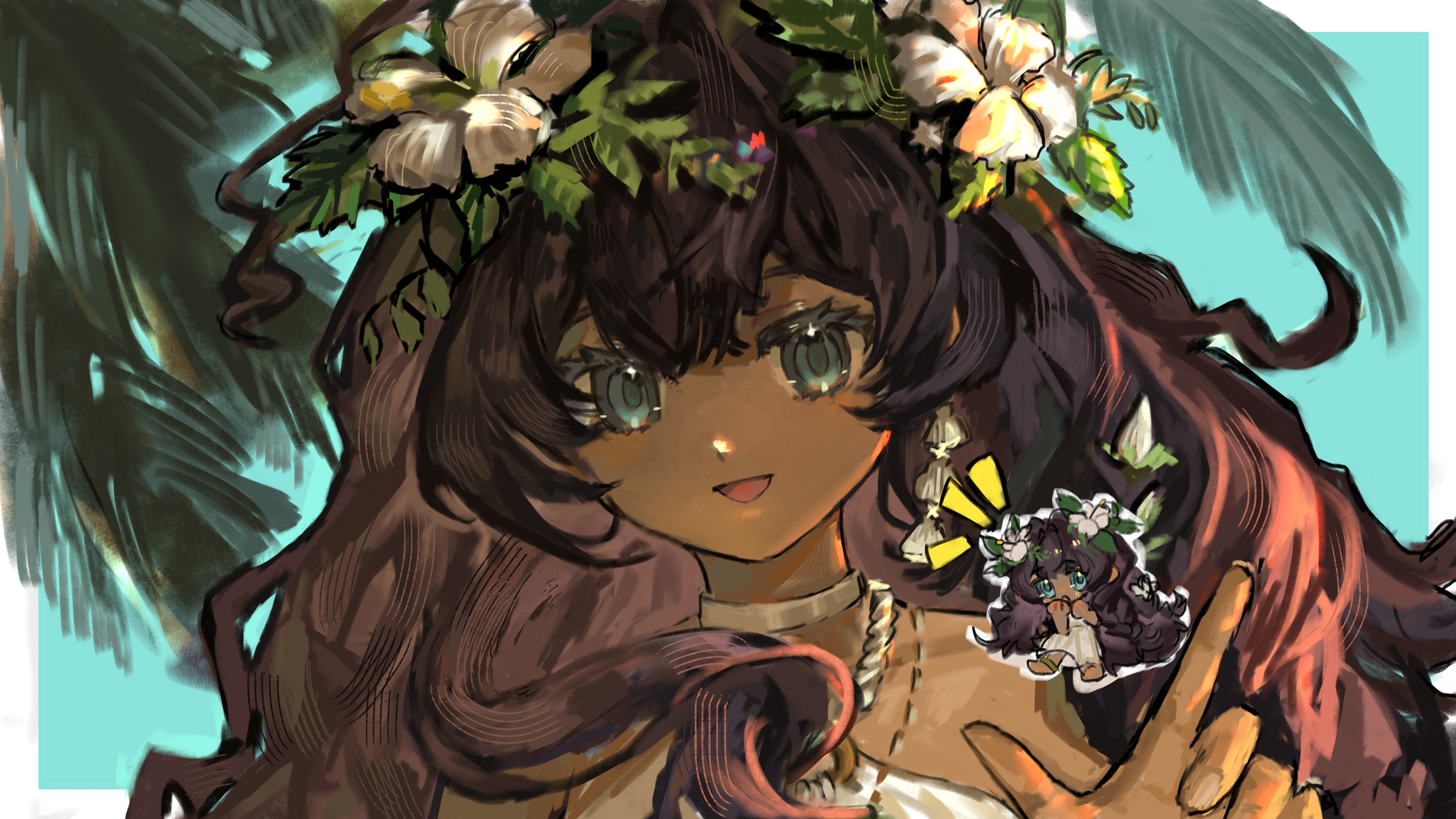 1girl :d absurdres aqua_background bare_shoulders blue_eyes brown_hair chibi chibi_inset dark-skinned_female dark_skin fatutu finger_gun flower hair_flower hair_ornament halter_shirt halterneck hand_up hibiscus highres leaf_hair_ornament long_hair looking_at_viewer multiple_views open_mouth palm_leaf portrait reverse:1999 shirt sleeveless sleeveless_shirt smile white_background white_flower xiangrikui_zhengdan