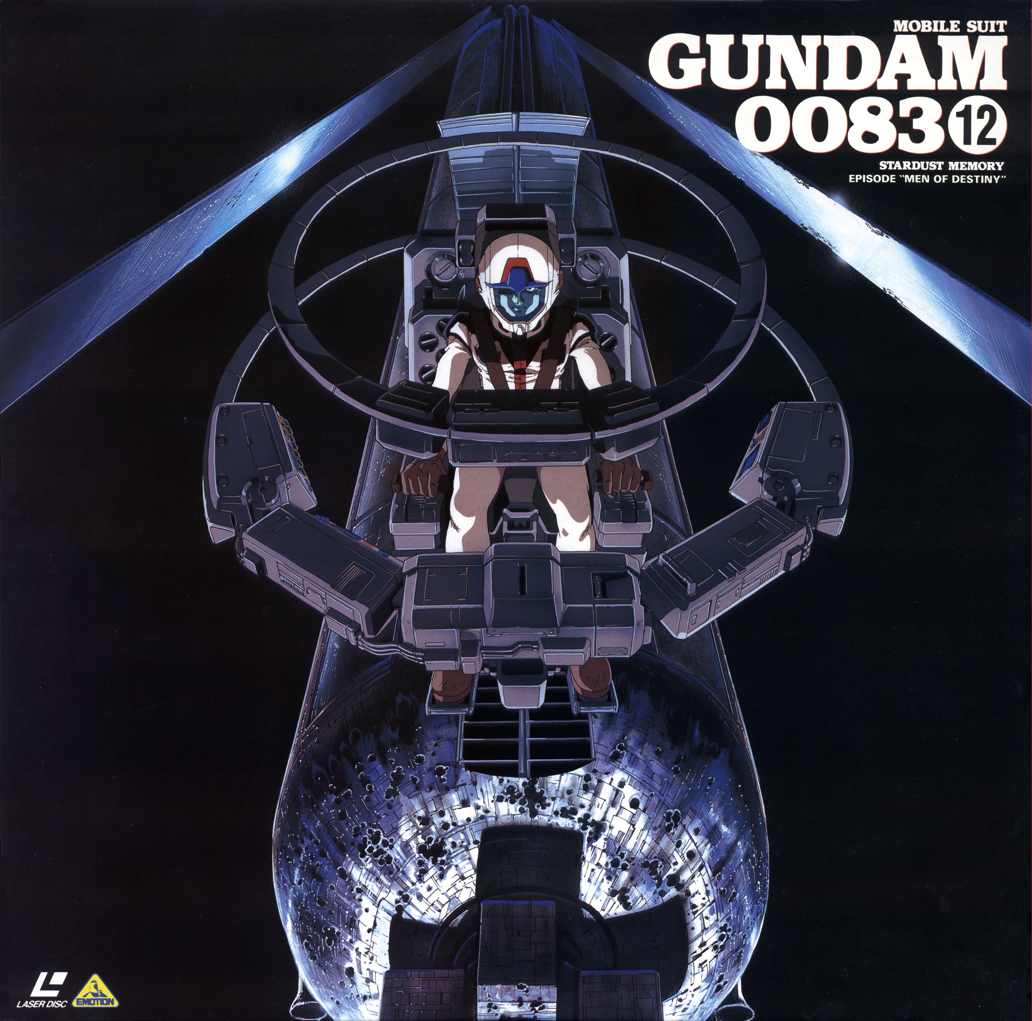 1990s_(style) 1boy absurdres cockpit earth_federation_space_forces gundam gundam_0083 gundam_gp-03_stamen highres kawamoto_toshihiro kou_uraki laserdisc_cover machinery mecha mecha_pilot_suit mobile_suit o'neill_cylinder official_art pilot pilot_chair retro_artstyle robot scan science_fiction screen solar_panel_wings title traditional_media