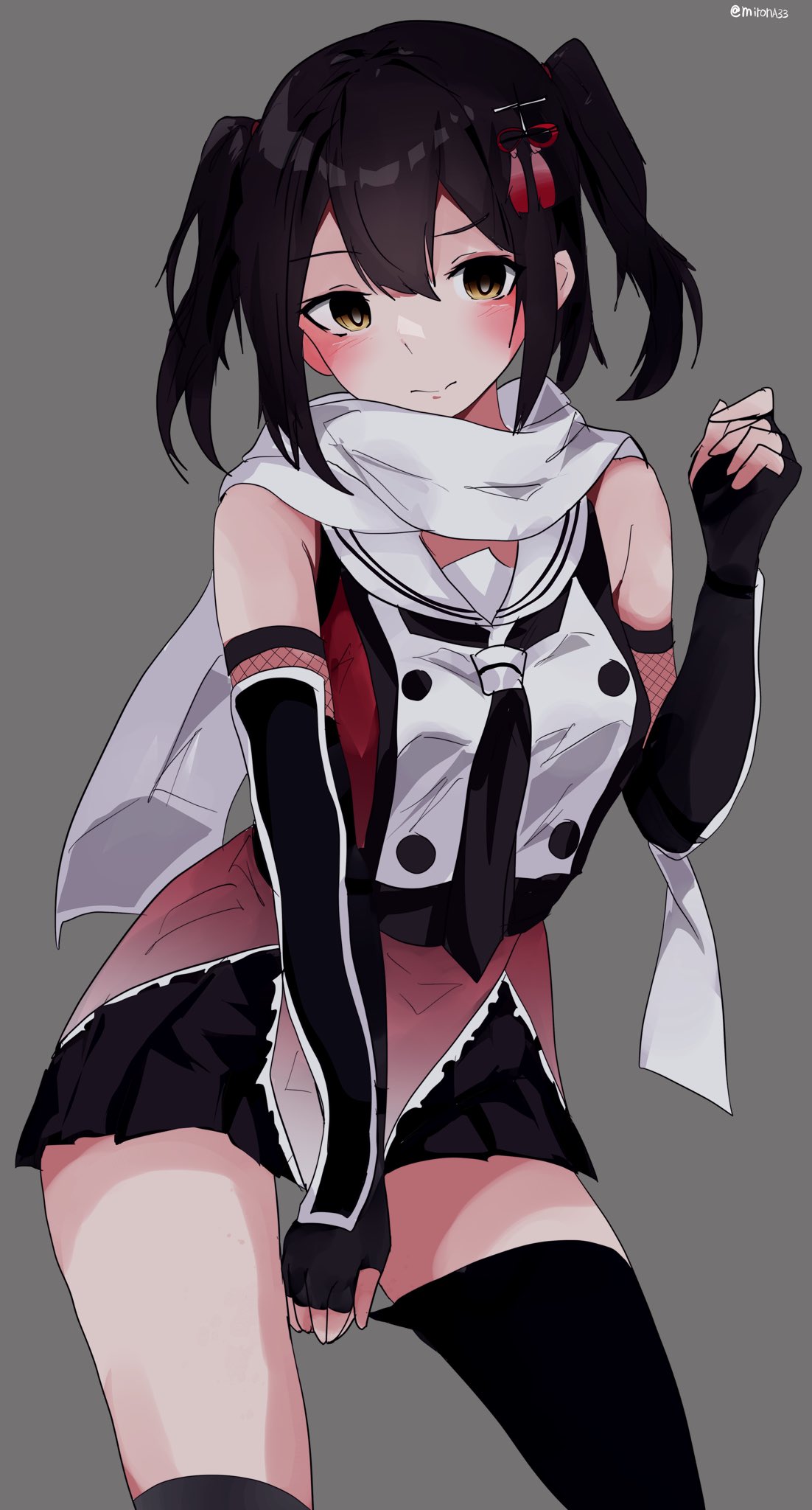 1girl alternate_costume black_neckerchief black_skirt buttons commentary_request contrapposto double-breasted elbow_gloves fingerless_gloves gloves grey_background highres kantai_collection kneehighs miron_(mirona33) neckerchief pleated_skirt red_shirt scarf school_uniform sendai_(kancolle) sendai_kai_ni_(kancolle) serafuku shirt simple_background single_kneehigh single_sock skirt sleeveless sleeveless_shirt smile socks solo twintails white_scarf