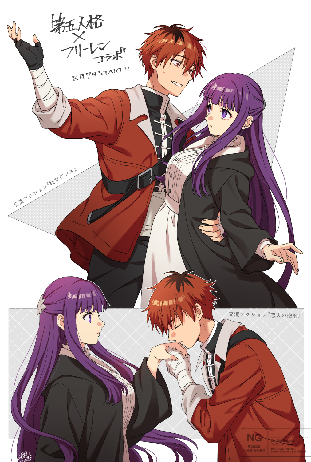 1boy 1girl :t amakura_(am_as) arm_around_back bandaged_arm bandages black_coat black_gloves black_pants black_shirt blunt_bangs breasts closed_eyes closed_mouth coat commentary_request dress fern_(sousou_no_frieren) fingerless_gloves gloves half_updo hand_up highres holding_hands kiss kissing_hand large_breasts long_hair long_sidelocks long_sleeves looking_at_viewer multiple_views open_clothes open_coat open_shirt pants parted_lips pout purple_eyes purple_hair red_hair red_shirt shirt short_hair sidelocks smile sousou_no_frieren standing stark_(sousou_no_frieren) straight_hair surprise_kiss surprised sweat translation_request very_long_hair very_short_hair watermark white_dress