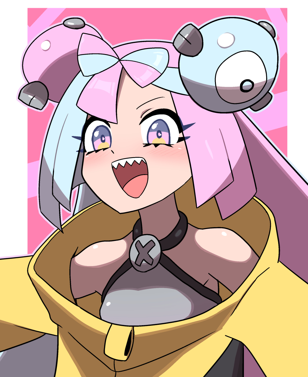 1girl :d bow-shaped_hair character_hair_ornament commentary_request grey_shirt hair_ornament happy highres iono_(pokemon) jacket long_hair multicolored_hair nintendo omoitsuka open_mouth pink_eyes pokemon pokemon_scarlet_and_violet sharp_teeth shirt sleeveless sleeveless_shirt smile solo teeth tongue two-tone_hair upper_body upper_teeth_only yellow_jacket