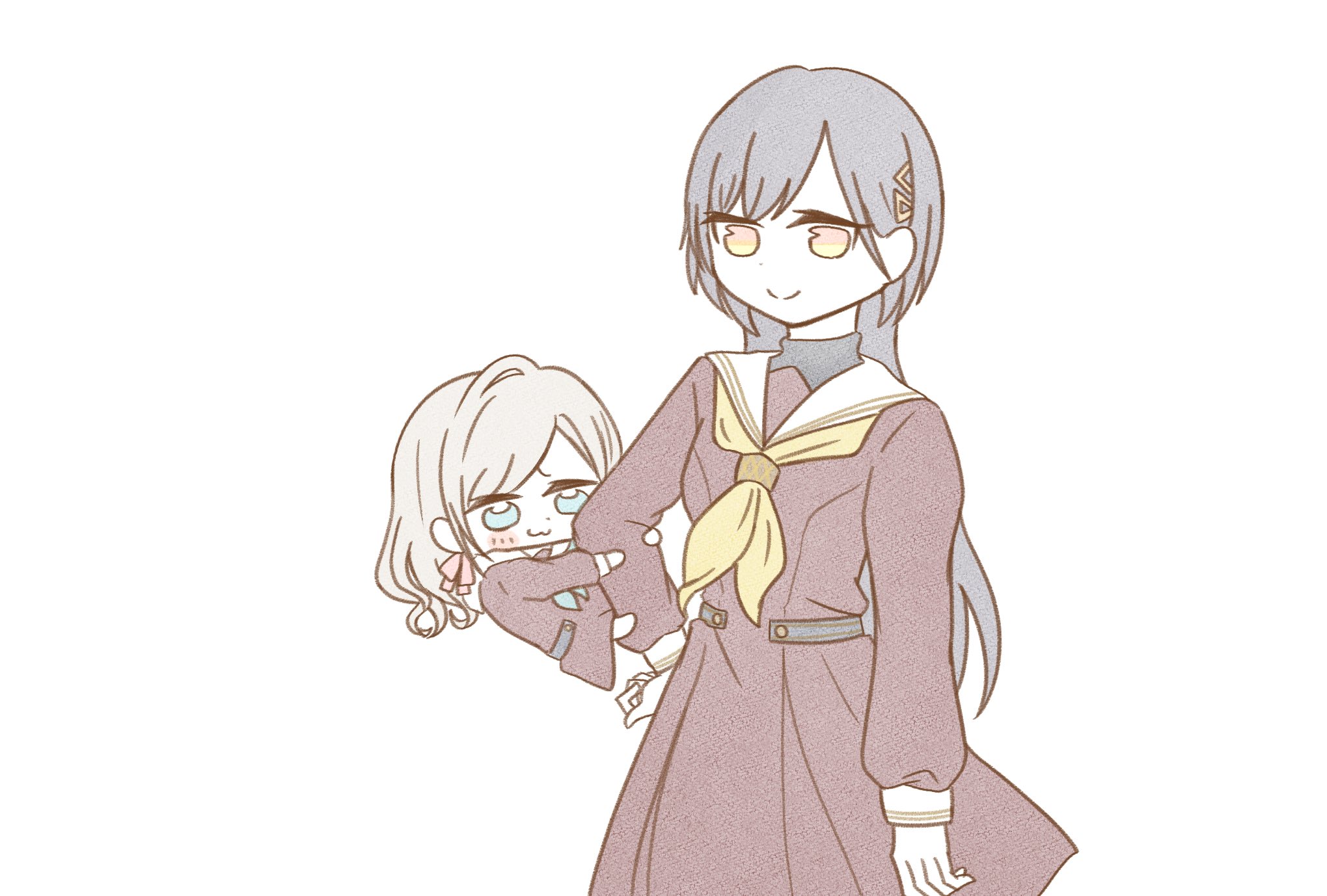 2girls :3 aqua_neckerchief black_hair blue_eyes blush ceras_yanagida_lilienfeld chibi closed_mouth commentary dress edel_note hair_ornament hair_ribbon hanging_on_another hanging_on_arm hasu_no_sora_school_uniform highres jellyfish_cut kai_(kkaaii0427) katsuragi_izumi link!_like!_love_live! long_hair love_live! medium_dress multiple_girls neckerchief orange_eyes pink_ribbon pleated_dress ribbon school_uniform triangle_hair_ornament virtual_youtuber yellow_neckerchief