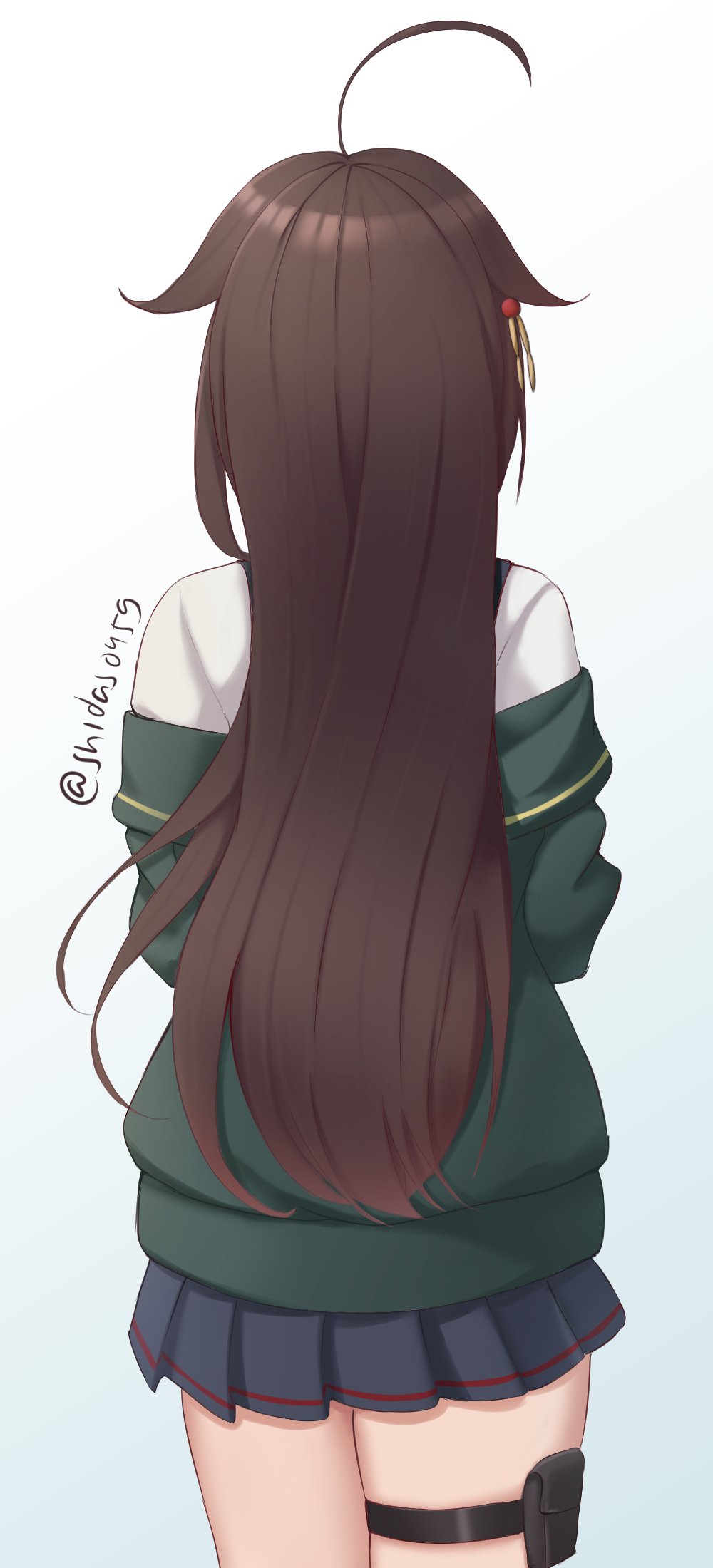 1girl ahoge black_skirt brown_eyes commentary english_commentary from_behind gradient_background hair_down hair_flaps highres kantai_collection off-shoulder_jacket off_shoulder one-hour_drawing_challenge shidas0459 shigure_(kancolle) shigure_(kure_2025)_(kancolle) shigure_kai_san_(kancolle) shirt skirt solo standing thigh_strap twitter_username white_background white_shirt