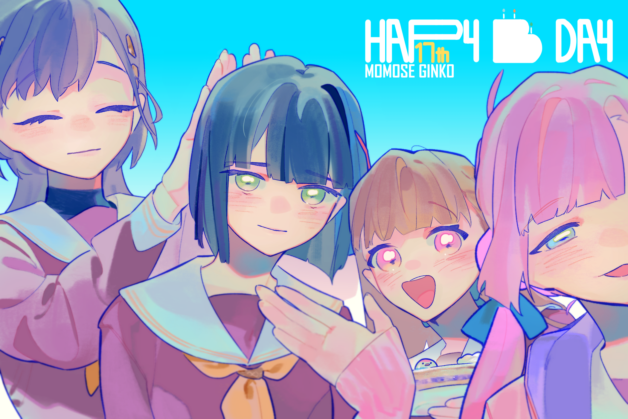 4girls :d anyoji_hime black_hair blue_eyes blunt_bangs blunt_ends blunt_sidelocks blush bob_cut braid brown_dress brown_hair bunny_ears_prank center-flap_bangs character_age character_name closed_eyes commentary dress grey_hair hair_ornament happy_birthday hasu_no_shousankaku hasu_no_sora_school_uniform highres kachimachi_kosuzu katsuragi_izumi link!_like!_love_live! long_sleeves looking_at_viewer love_live! momose_ginko multiple_girls neckerchief open_mouth pink_eyes pipi_(m1x_mix) sailor_collar sailor_dress school_uniform short_hair side_braids sidelocks sleeves_past_wrists smile teeth triangle_hair_ornament tsuru_(love_live!) upper_body upper_teeth_only virtual_youtuber white_sailor_collar winter_uniform yellow_neckerchief