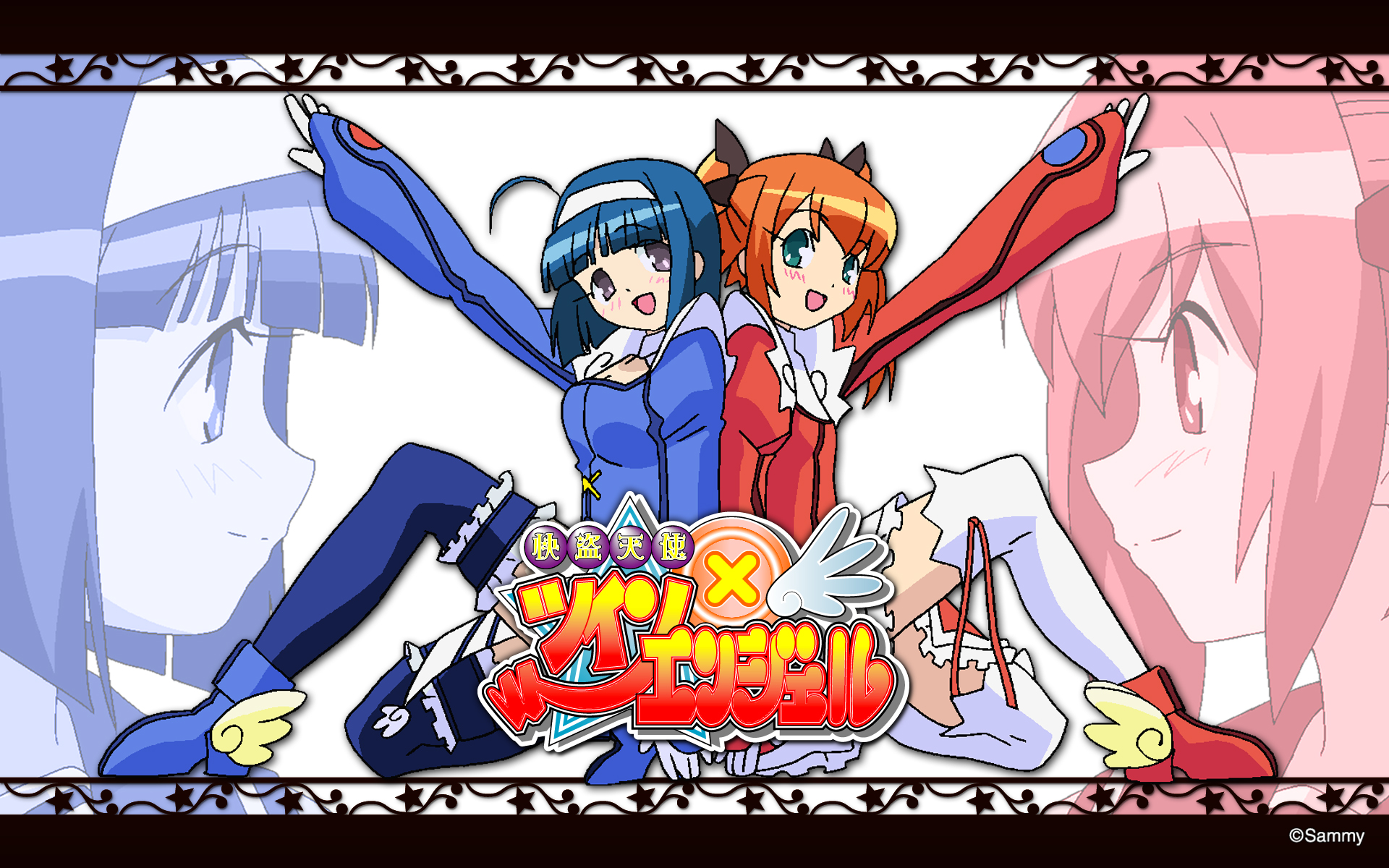 2girls blue_eyes blue_thighhighs blush copyright_name dot_nose female_focus full_body headband highres kaitou_tenshi_twin_angel kannazuki_aoi long_sleeves looking_at_viewer magical_girl medium_hair minazuki_haruka_(twin_angel) multiple_girls official_art open_mouth orange_hair shoes sitting thighhighs twin_angel white_headband white_thighhighs