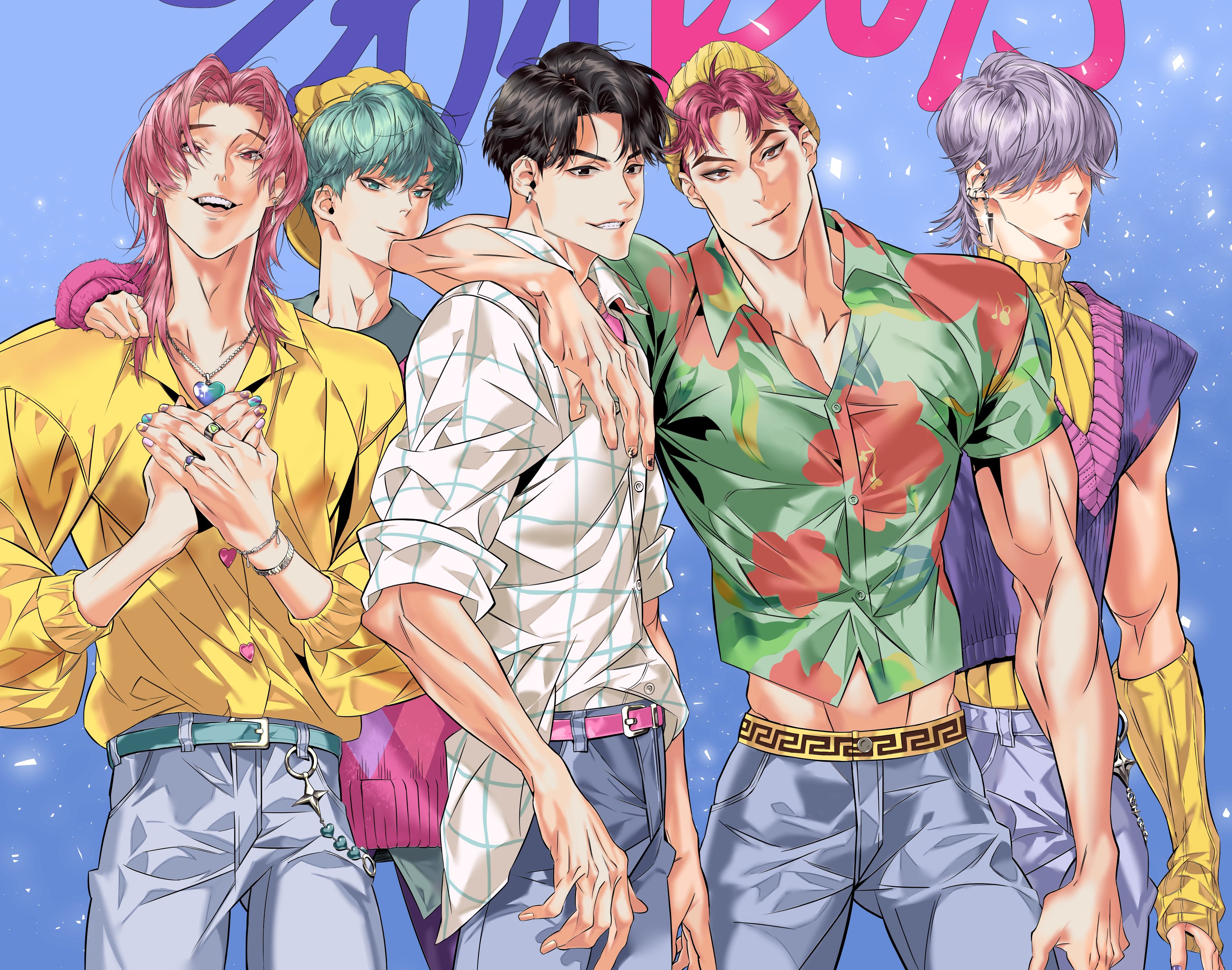 5boys abby_(kpop_demon_hunters) absurdres aqua_belt aqua_eyes aqua_hair arm_around_neck arm_warmers baby_(kpop_demon_hunters) beanie belt black_eyes black_hair blue_background buttons closed_mouth collared_shirt cowboy_shot detached_sleeves earrings grey_hair grey_pants grid_print hair_between_eyes hair_over_eyes hands_on_own_chest hat hawaiian_shirt heart heart_button heart_necklace highres jewelry jinu_(kpop_demon_hunters) kpop_demon_hunters long_hair long_sleeves male_focus midriff multiple_boys multiple_rings muscular muscular_male mystery_(kpop_demon_hunters) nail_polish necklace open_mouth own_hands_together pants parted_bangs parted_lips pectorals pink_belt pink_eyes pink_hair pink_shirt pink_sweater print_shirt puffy_long_sleeves puffy_sleeves ring romance_(kpop_demon_hunters) shirt shirt_under_shirt short_hair short_sleeves sleeves_rolled_up smile sweater tight_clothes tight_shirt turtleneck turtleneck_sweater worldsound77 yellow_arm_warmers yellow_hat yellow_shirt yellow_sweater