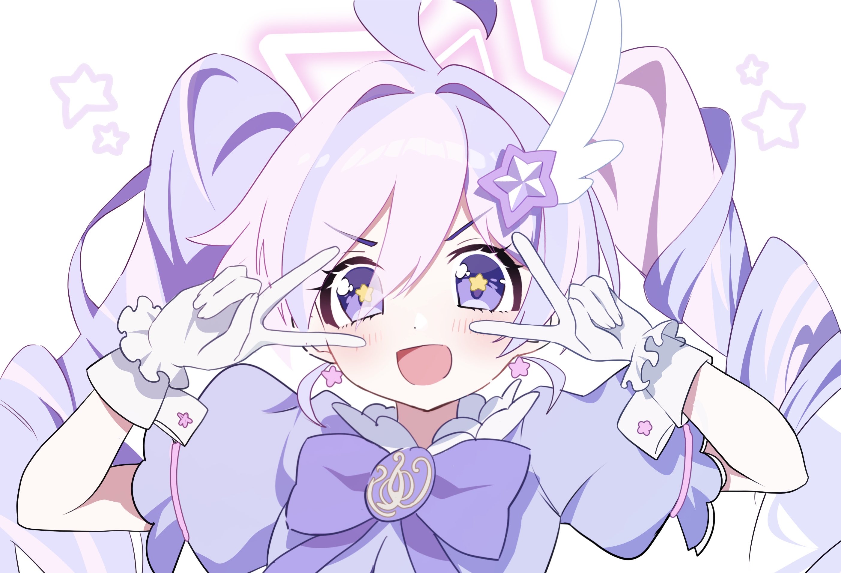 +_+ 1girl :d ahoge blue_archive bow bowtie commentary double_v drill_hair gloves hair_ornament halo highres long_hair looking_at_viewer magical_girl multicolored_hair official_alternate_costume open_mouth pineap000 pink_hair pink_halo puffy_sleeves purple_bow purple_bowtie purple_eyes purple_hair reisa_(blue_archive) reisa_(magical)_(blue_archive) short_sleeves simple_background smile solo star_(symbol) star_hair_ornament star_halo twin_drills twintails two-tone_hair upper_body v white_background white_gloves wing_hair_ornament