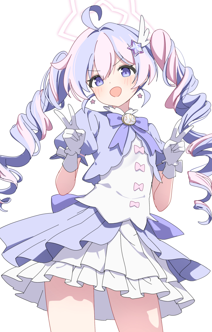 1girl ahoge blue_archive blue_hair blush bow bowtie double_v earrings foulo_paints gloves hair_between_eyes hair_ornament halo jewelry long_hair looking_at_viewer multicolored_hair official_alternate_costume open_mouth pink_hair pink_halo puffy_short_sleeves puffy_sleeves purple_bow purple_bowtie purple_eyes purple_hair purple_skirt reisa_(blue_archive) reisa_(magical)_(blue_archive) short_sleeves simple_background skirt smile solo star_(symbol) star_earrings star_hair_ornament streaked_hair twintails two-tone_hair upper_body v white_background white_gloves