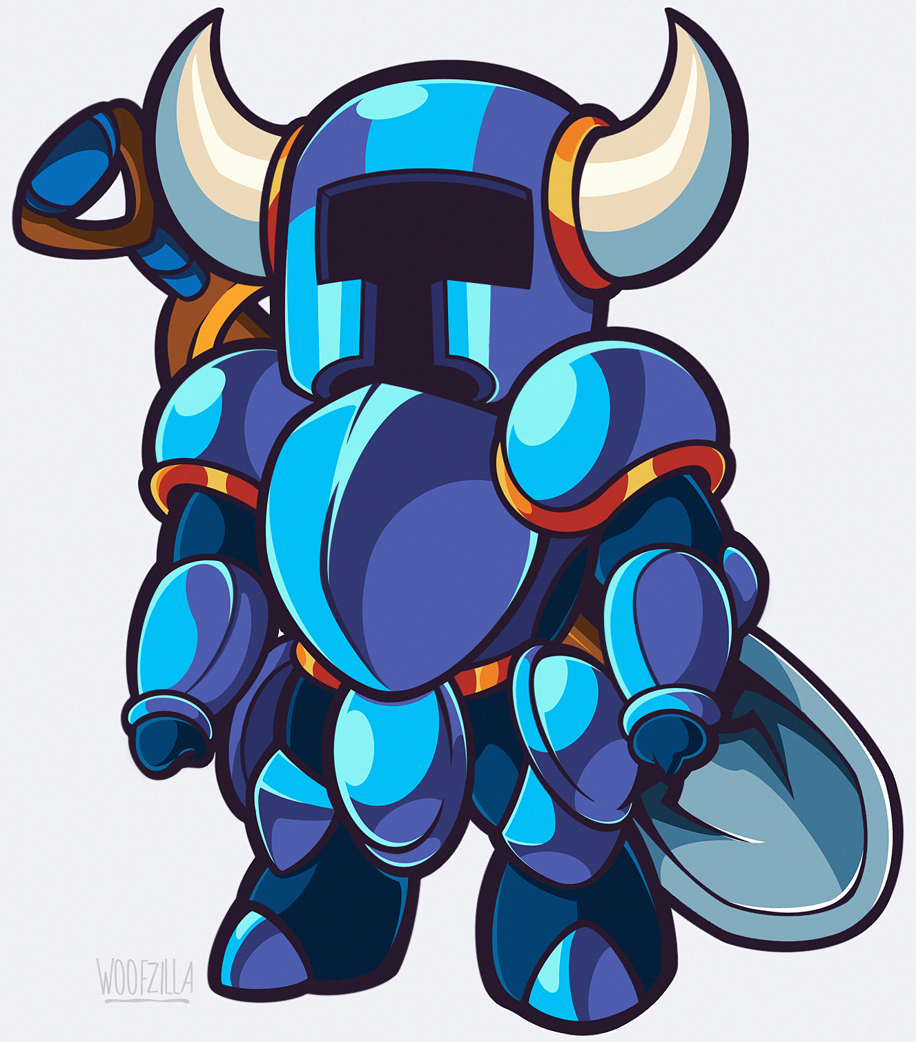 1boy armor blue_armor commentary english_commentary fake_horns full_armor full_body helmet highres horned_helmet horns knight shovel shovel_knight shovel_knight_(character) simple_background solo standing white_background woofzilla