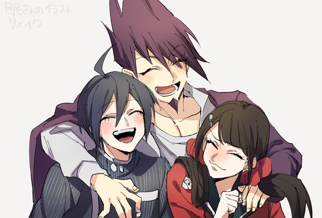 1girl 2boys ahoge arm_around_shoulder black_hair black_jacket black_sailor_collar blunt_bangs blush brown_hair closed_eyes collarbone collared_jacket commentary_request danganronpa_(series) danganronpa_v3:_killing_harmony facial_hair goatee hair_between_eyes hair_ornament hair_scrunchie happy harukawa_maki height_difference jacket long_hair long_sleeves low_twintails mole mole_under_eye momota_kaito multiple_boys open_clothes open_mouth pinstripe_jacket pinstripe_pattern purple_facial_hair purple_hair red_scrunchie red_shirt saihara_shuichi sailor_collar school_uniform scrunchie shirt short_hair simple_background smile spiked_hair striped_clothes sunabu twintails upper_body