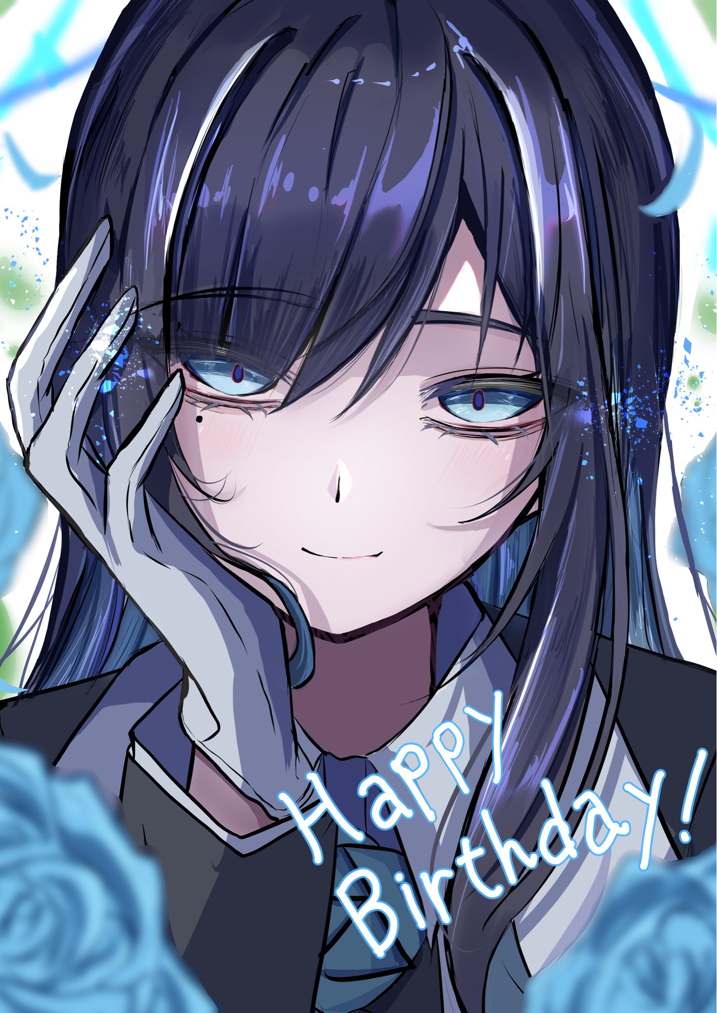 1girl ado_(utaite) black_hair blue_eyes blue_flower blue_hair blue_rose chando_(ado) closed_mouth commentary dress flower gloves hand_on_own_cheek hand_on_own_face happy_birthday highres looking_at_viewer megu_(9abgoluanvcjd7o) mole mole_under_eye portrait rose solo utaite white_gloves