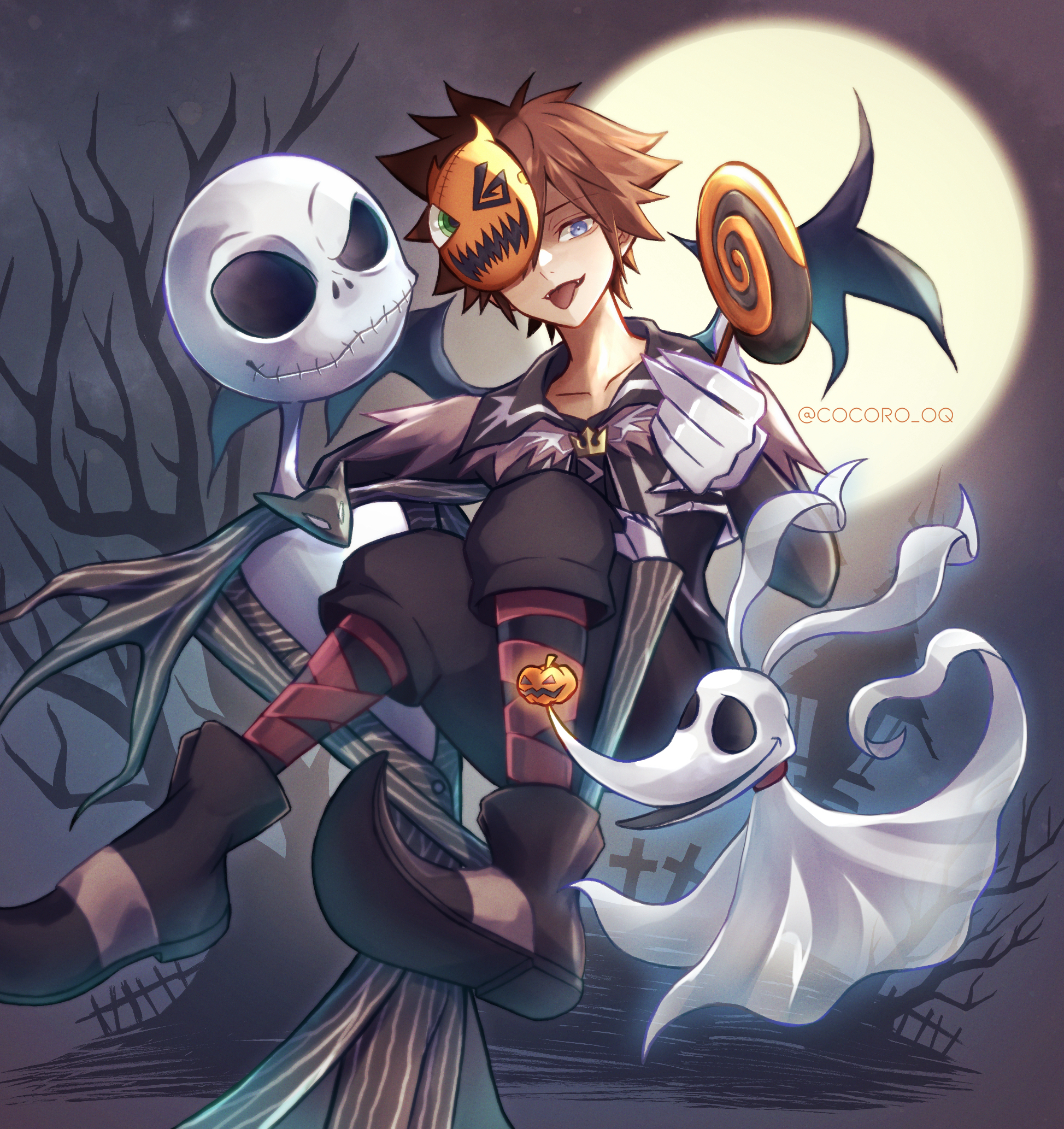 2boys bat_wings blue_eyes brown_hair candy carrying carrying_person cocoro_oq commentary_request fangs food food-themed_hair_ornament full_moon ghost hair_ornament highres holding holding_candy holding_food holding_lollipop jack_skellington kingdom_hearts lollipop looking_at_viewer moon multiple_boys night official_alternate_costume outdoors pumpkin_hair_ornament short_hair skeleton sora_(halloween_town)_(kingdom_hearts) sora_(kingdom_hearts) spiked_hair swirl_lollipop the_nightmare_before_christmas tongue tongue_out wings zero_(nbc)