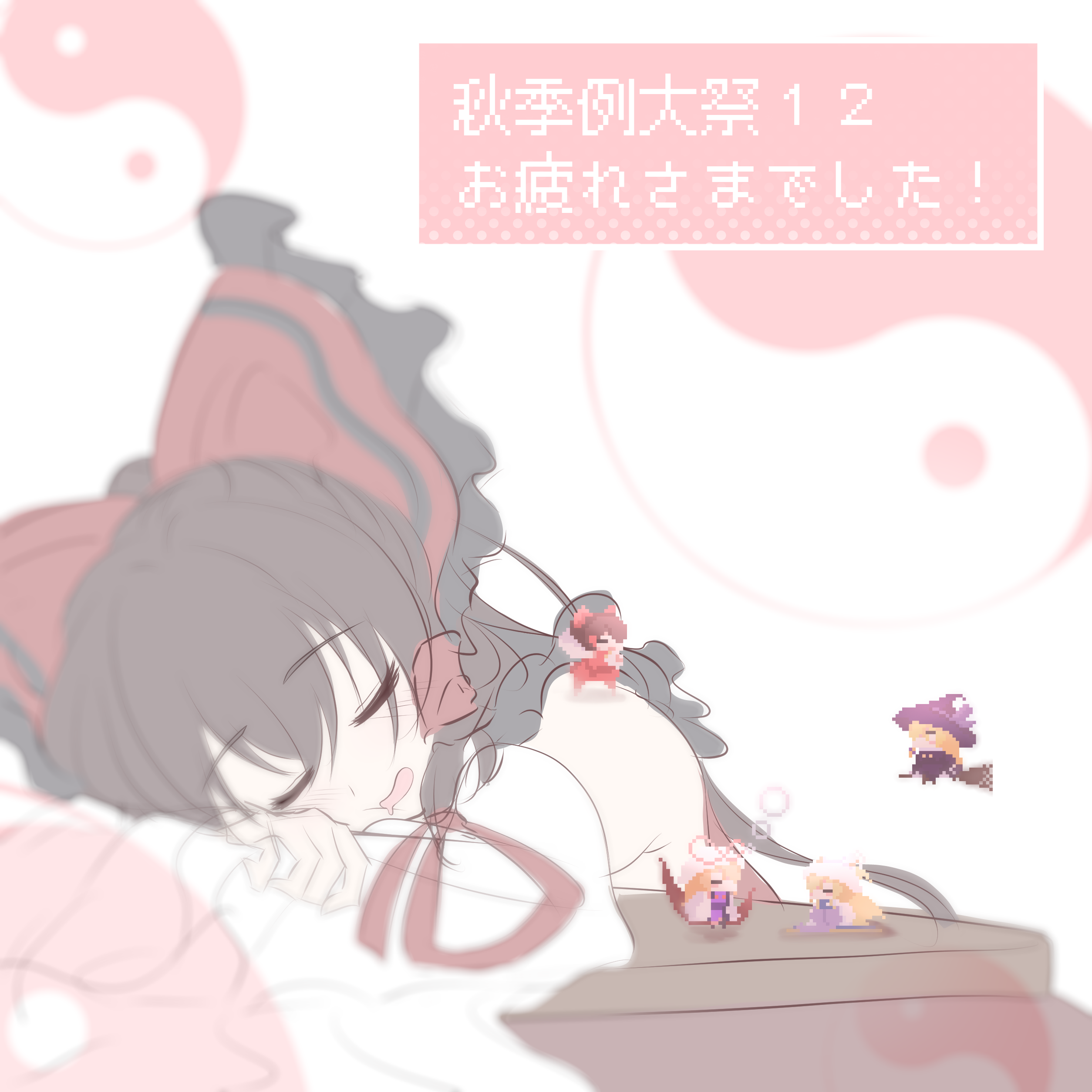 4girls absurdres bow broom broom_riding brown_hair closed_eyes commentary_request detached_sleeves drooling frilled_bow frilled_hair_tubes frills gap_(touhou) hair_bow hair_tubes hakurei_reimu hat highres kirisame_marisa kotatsu long_hair mini_person minigirl mouth_drool multiple_girls open_mouth red_bow rinkaito1231 sketch sleeping table touhou translation_request under_kotatsu under_table witch_hat yakumo_ran yakumo_yukari yin_yang