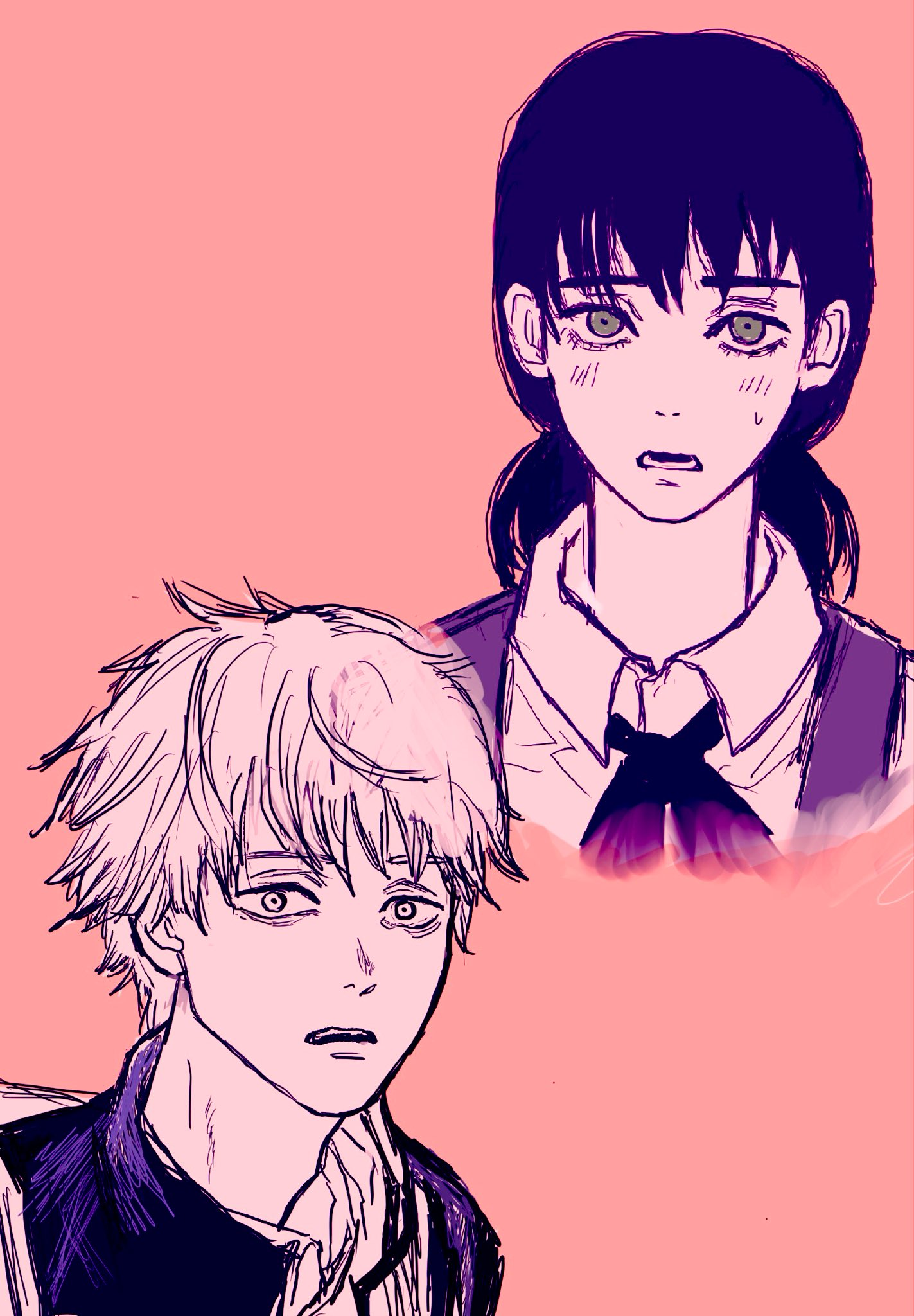 1boy 1girl blonde_hair chainsaw_man denji_(chainsaw_man) dress fourth_east_high_school_uniform gakuran highres long_hair looking_at_viewer low_twintails mitaka_asa open_mouth pinafore_dress pink_background purple_dress school_uniform sky8bow sleeveless sleeveless_dress sweatdrop twintails