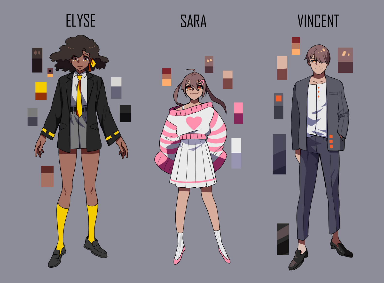 1girl 2boys :3 ahoge black_hair black_jacket bob_cut brown_eyes character_name collared_shirt color_guide dark-skinned_female dark_skin elyse_(i'm_the_grim_reaper) full_body graveweaver grey_jacket grey_shorts hair_ornament hairclip hand_in_pocket hands_on_own_hips i'm_the_grim_reaper jacket looking_at_viewer multiple_boys necktie official_art orange_eyes reference_sheet sara_(i'm_the_grim_reaper) shirt short_hair short_twintails shorts single_off_shoulder skirt socks standing striped_clothes striped_sweater sweater twintails vest vincent_(i'm_the_grim_reaper) white_shirt white_skirt white_socks white_vest yellow_necktie yellow_socks