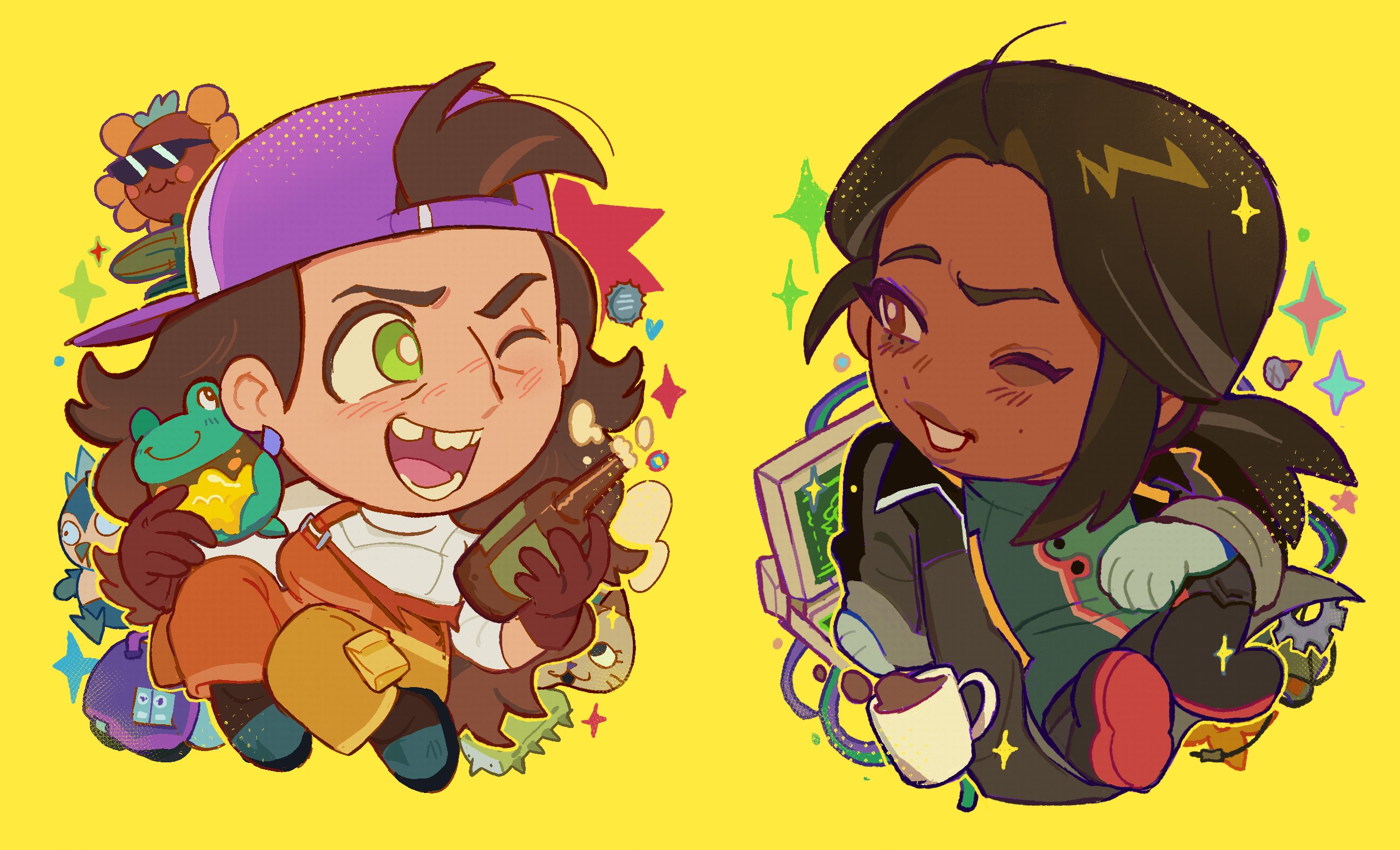 2girls andrea_(knights_of_guinevere) black_hair brown_hair chibi francesca_(knights_of_guinevere) full_body gat_(hat) gloves green_eyes hair_intakes hat highres knights_of_guinevere long_hair looking_at_viewer multiple_girls overalls suwu159