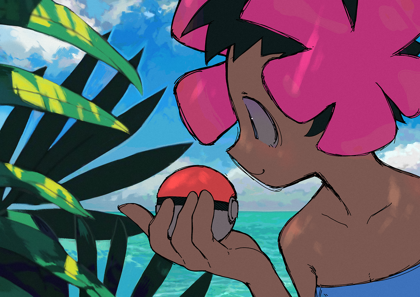 1girl commentary dark-skinned_female dark_skin flower hair_flower hair_ornament holding holding_poke_ball nintendo ocean phoebe_(pokemon) pink_flower poke_ball pokemon pokemon_ruby/sapphire/emerald pyoko_(sandwicha) short_hair solo