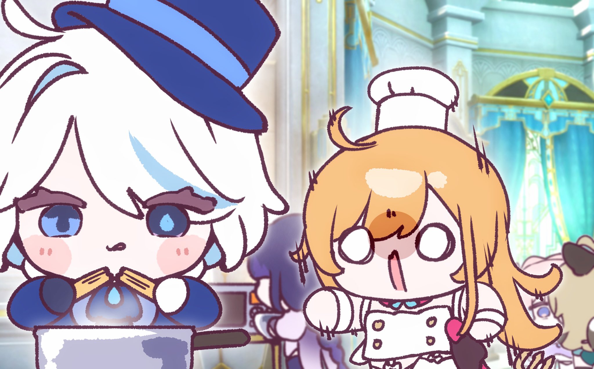 5girls apron ascot asymmetrical_gloves blue_ascot blue_gem blue_hat blue_jacket chef chef_hat cooking dress drop-shaped_pupils escoffier_(genshin_impact) eyelash_ornament food furina_(genshin_impact) gem genshin_impact gloves hat heterochromia highres jacket kirara_(genshin_impact) long_hair mikurumikurumi mismatched_gloves mismatched_pupils multicolored_hair multiple_girls pasta purple_dress purple_hair raiden_shogun sangonomiya_kokomi streaked_hair surprised symbol-shaped_pupils top_hat waist_apron white_hat