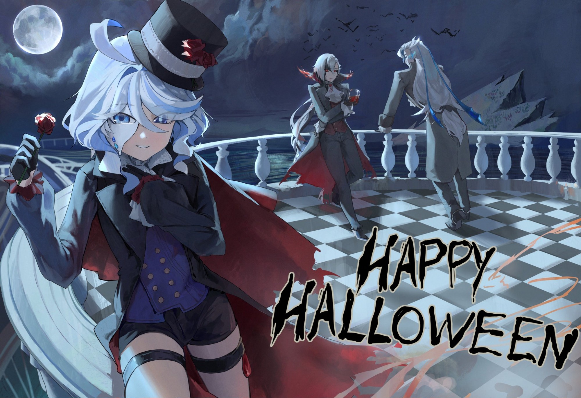 1boy 2girls arlecchino_(genshin_impact) bat_(animal) black_eyes blue_eyes blue_shirt cape coat drop-shaped_pupils eyelash_ornament fingernail_gloves flower furina_(genshin_impact) genshin_impact gradient_skin grey_coat halloween halloween_costume happy_halloween hat heterochromia highres holding holding_flower mismatched_pupils moon multicolored_hair multiple_girls neuvillette_(genshin_impact) popped_collar red_flower red_pupils red_rose rose shirt streaked_hair symbol-shaped_pupils top_hat trick_or_treat vampire vampire_costume white_hair yukii91218