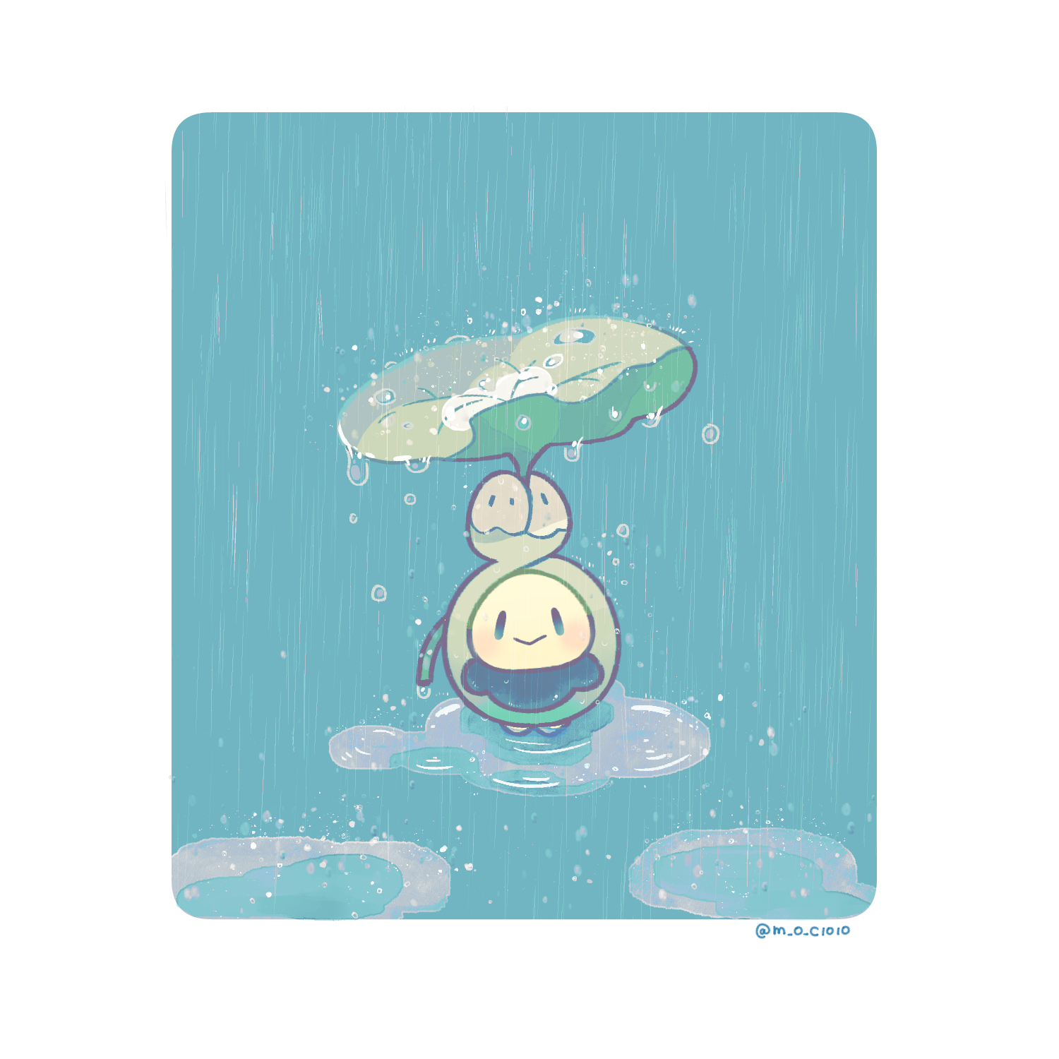 10moc10 :> blush border budew closed_mouth full_body gen_4_pokemon highres leaf nintendo no_humans pokemon pokemon_(creature) pokemon_focus puddle rain smile solo twitter_username water white_border