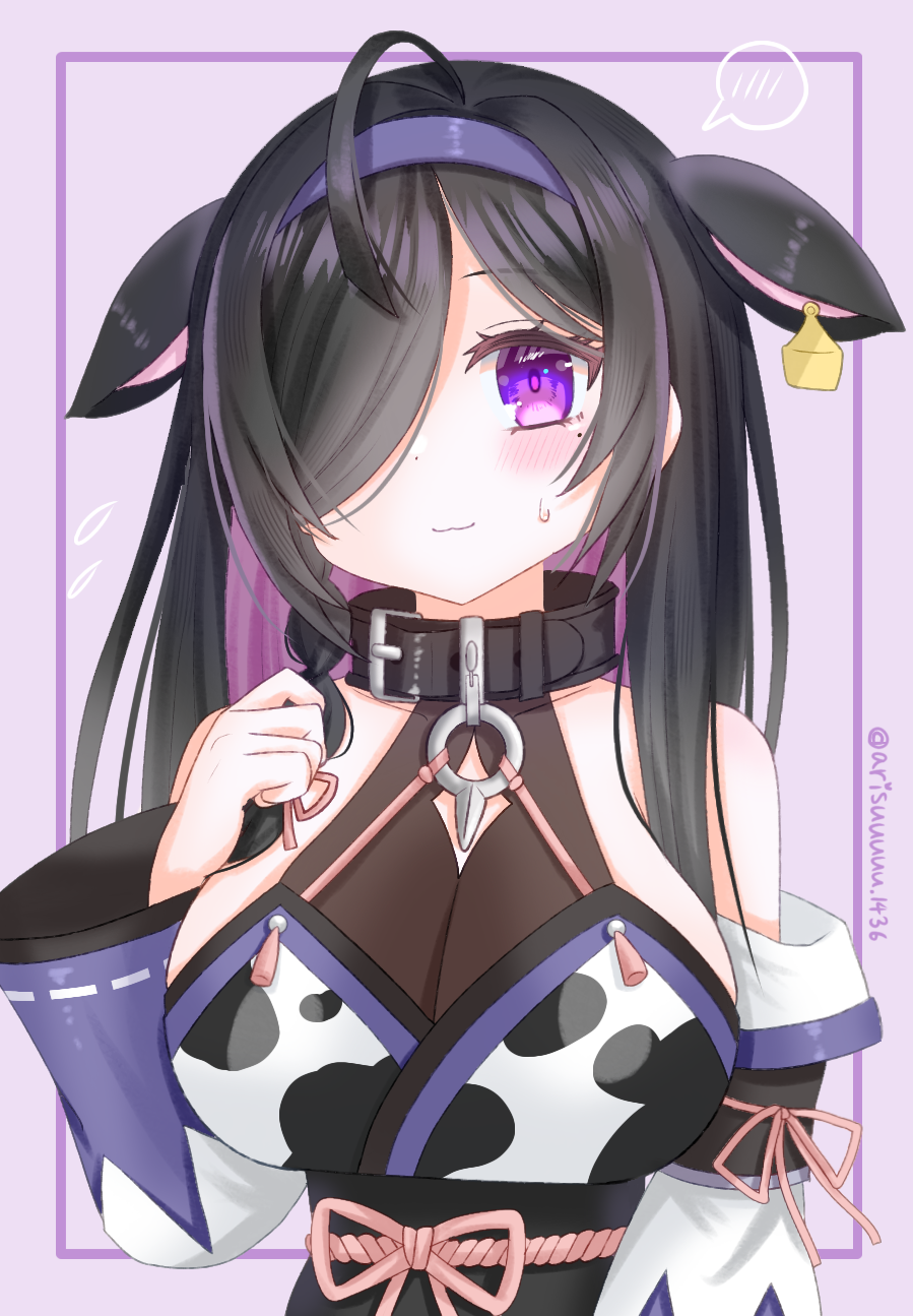 1girl :3 ahoge animal animal_ears animal_print arisuuuuu.1436 breasts collar comedic_sweatdrop cow cow_ears cow_print furry hairband highres large_breasts long_hair nijisanji purple_eyes shy sweatdrop virtual_youtuber yagyu_shino