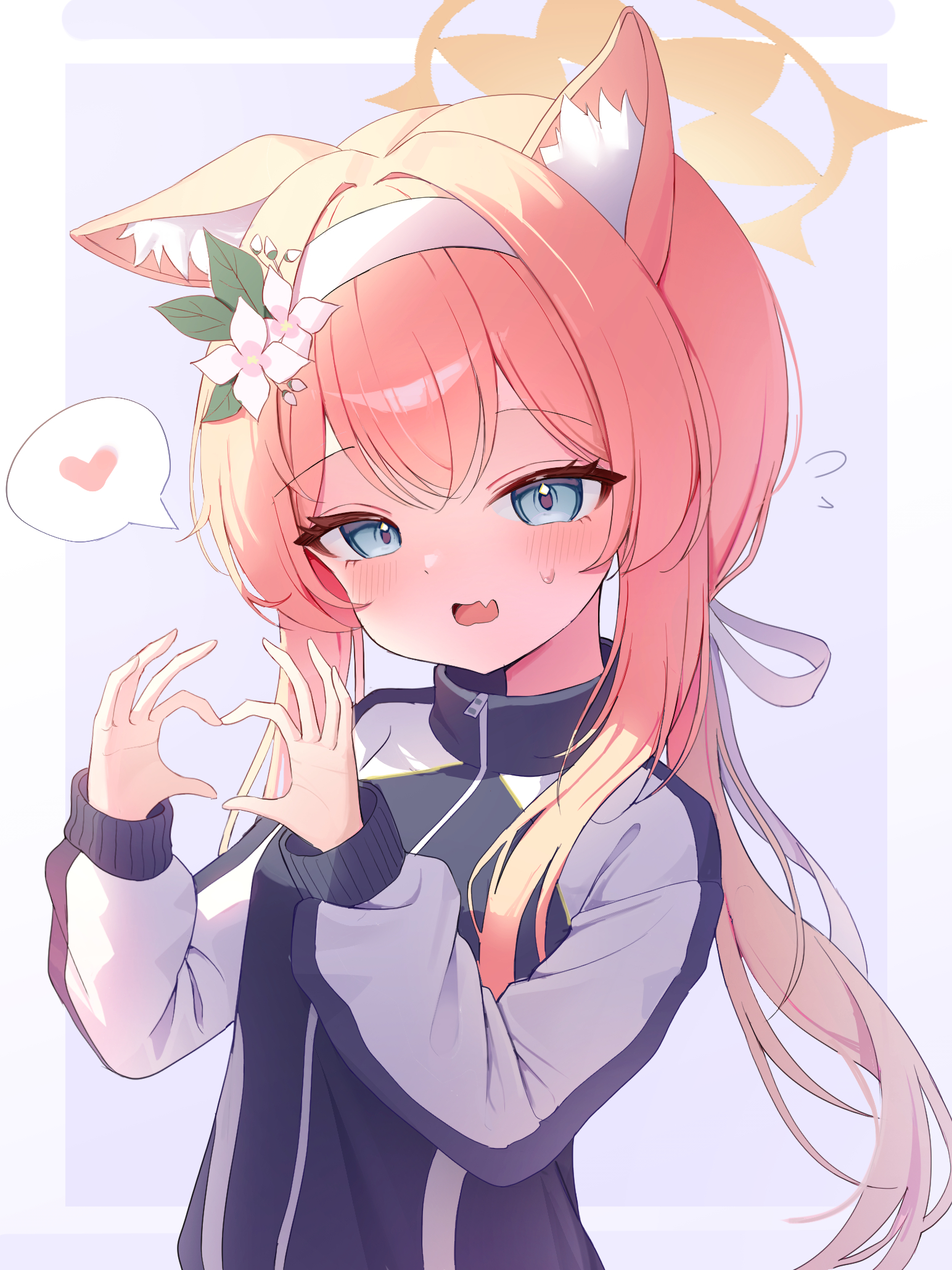 1girl animal_ears blonde_hair blue_archive blue_eyes blush breasts cat_ears dlrkdals070707 fang gym_uniform halo heart heart_hands highres long_hair looking_at_viewer mari_(blue_archive) mari_(track)_(blue_archive) official_alternate_costume official_alternate_hairstyle open_mouth small_breasts solo upper_body yellow_halo