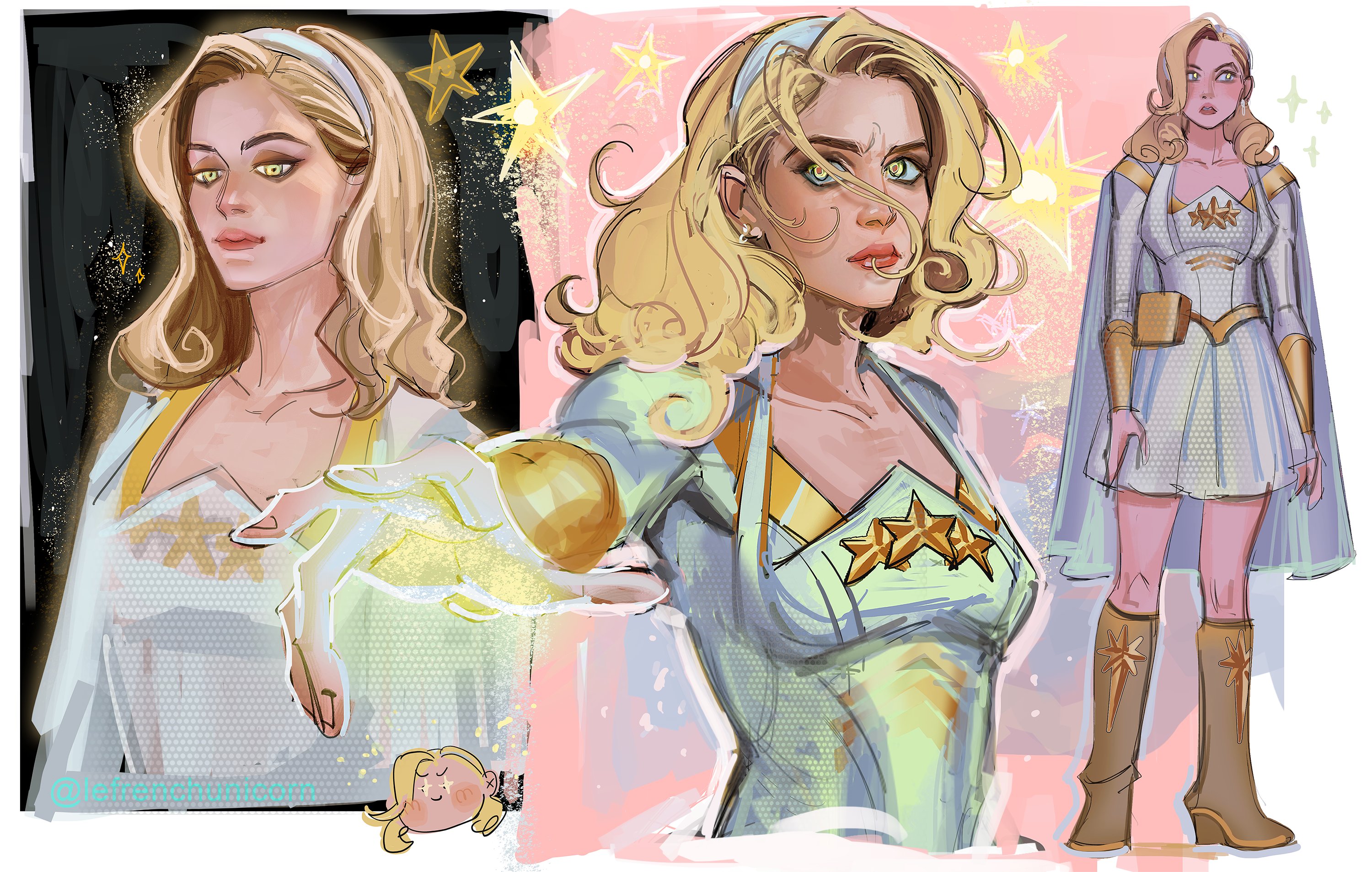 1boy blonde_hair boots breasts brown_boots cape chibi chibi_inset dress french-unicorn full_body gold_trim hairband highres long_hair medium_breasts multiple_views outstretched_hand sketch sparkling_eyes standing starlight_(the_boys) superhero_costume the_boys upper_body wavy_hair white_cape white_dress white_hairband yellow_eyes