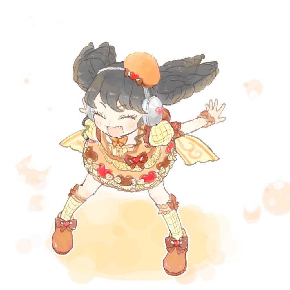 1girl :d ^_^ black_hair brown_dress brown_shoes closed_eyes commentary_request dress facing_viewer fang full_body gaaruru_(pripara) hat headphones heart heart_print leaning_forward long_hair mini_hat morio_(ce_note) open_mouth orange_hat pretty_series pripara shoes smile socks solo standing twintails yellow_socks