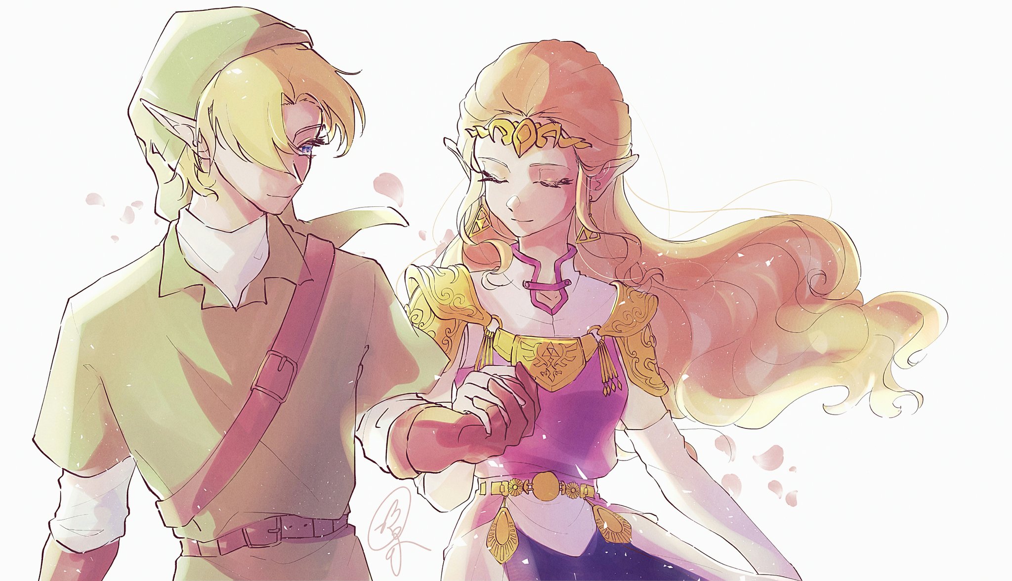 1boy 1girl armor breasts brown_gloves circlet closed_eyes couple dress elbow_gloves gloves gold_armor green_hat green_tunic hair_over_one_eye hat hetero highres holding_hands light_smile link long_hair medium_breasts nintendo phrygian_cap pink_dress pointy_ears princess_zelda shirt short_hair shoulder_armor sidelocks the_legend_of_zelda the_legend_of_zelda:_ocarina_of_time tica_tiforzelda tunic upper_body white_background white_gloves white_shirt