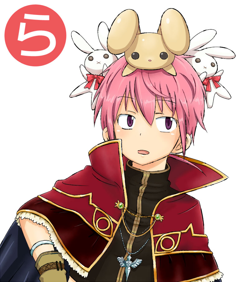 1boy black_shirt brown_gloves capelet commentary_request fur-trimmed_capelet fur_trim gloves hair_ornament high_wizard_(ragnarok_online) looking_afar male_focus nama_mana open_mouth pink_hair purple_eyes rabbit_hair_ornament ragnarok_online red_capelet shirt short_hair simple_background solo upper_body white_background