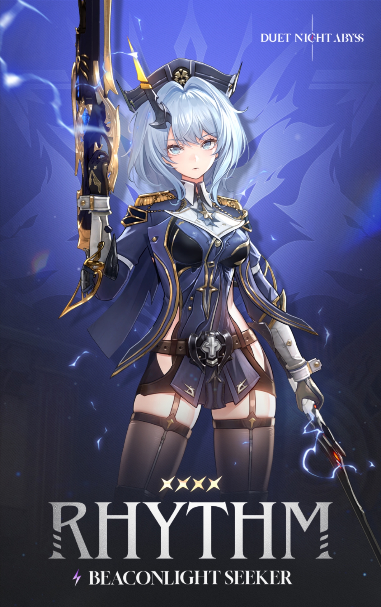 1girl armor duet_night_abyss grey_eyes grey_hair highres medium_hair rhythm_(duet_night_abyss) serious skirt sword text_background upper_body weapon