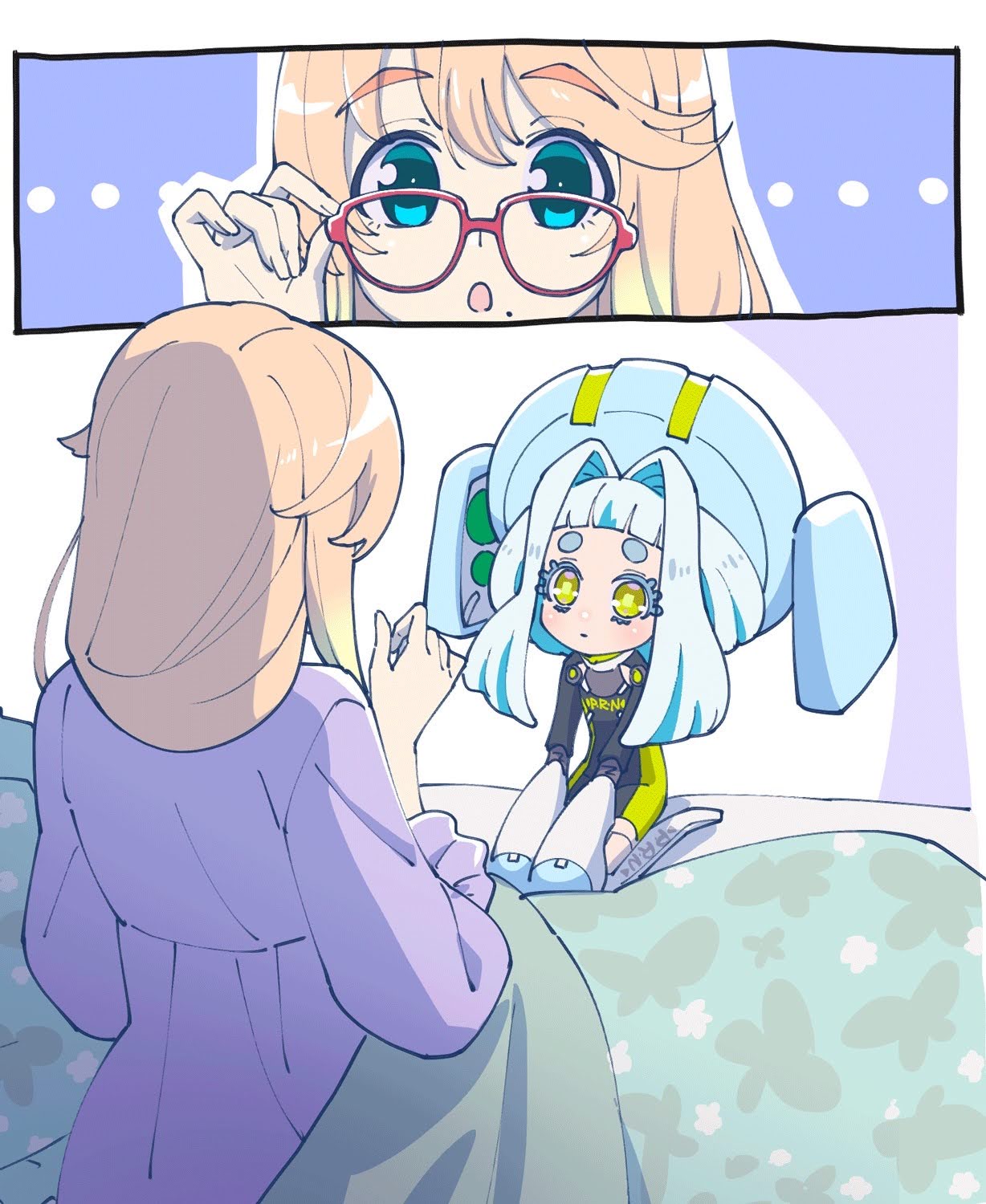 ... 2girls :o adjusting_eyewear alternate_costume aqua_eyes black_bodysuit blonde_hair blue_hair blue_hat blunt_bangs bodysuit closed_mouth colored_eyelashes colored_inner_hair commentary_request dress expressionless from_behind glasses gradient_hair hair_intakes haruno_sora hasegawa_umi hat highres large_hat long_hair long_sidelocks looking_at_another mechanical_hands mechanical_legs medium_hair mole mole_under_mouth multicolored_hair multiple_girls no_jacket official_art orange_hair poron-chan purple_dress red-framed_eyewear second-party_source seiza short_bangs short_eyebrows sidelocks simple_background sitting sleepwear square_pupils thick_eyebrows voicepeak voiceroid white_background yellow_eyes