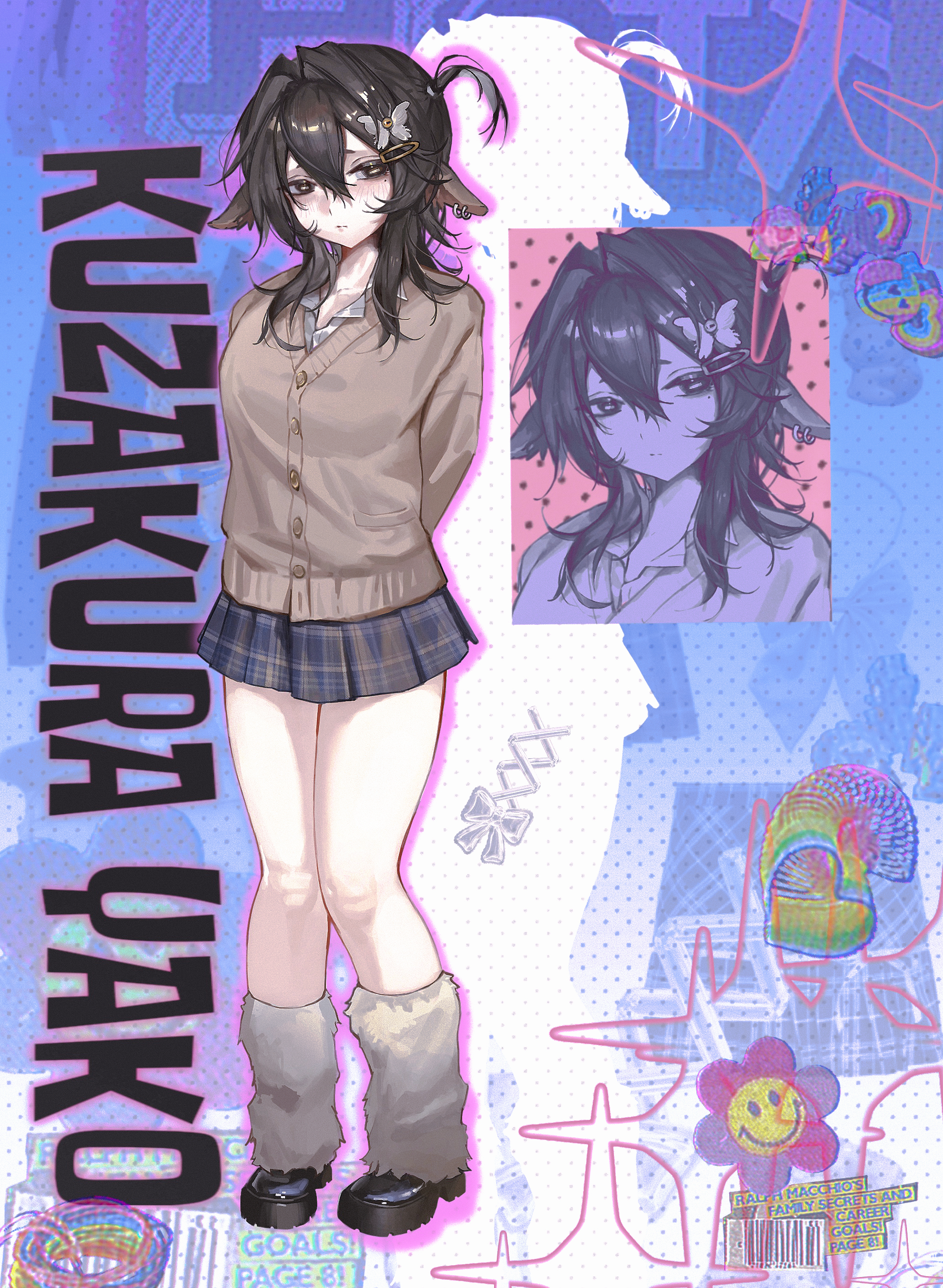1girl absurdres animal_ear_piercing animal_ears arms_behind_back black_eyes black_hair blue_skirt blush brown_skirt brown_sweater butterfly_hair_ornament character_name chinese_commentary closed_mouth collared_shirt commentary_request full_body goat_ears goat_girl gyaru hair_between_eyes hair_ornament hairclip highres hooves horizontal_pupils kirihara_aki kuzakura_yako_(kirihara_aki) legs long_hair long_sleeves miniskirt mole mole_under_eye multicolored_skirt multiple_views original plaid_clothes plaid_skirt shirt shirt_under_sweater sidelocks skirt standing sweater tachi-e thighs two-tone_skirt white_shirt yellow_pupils