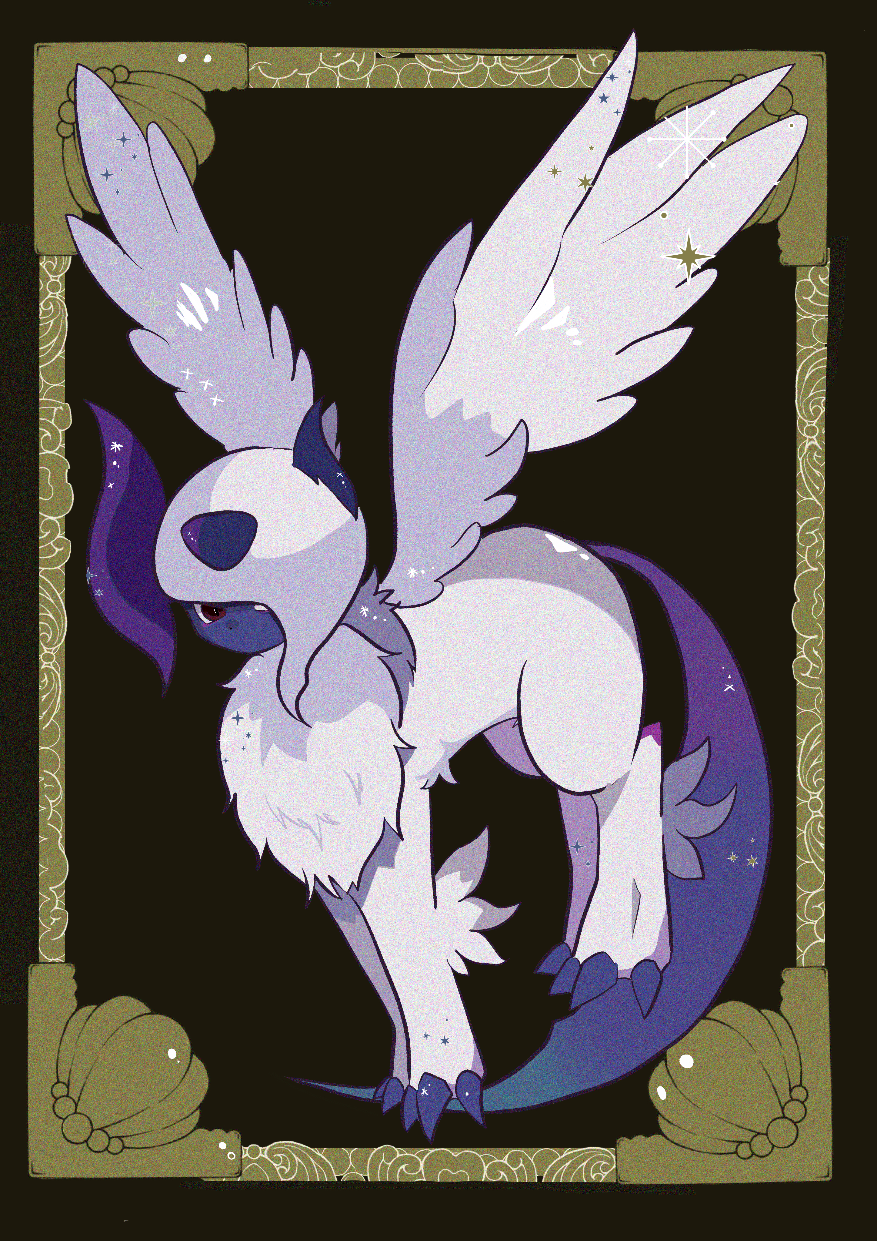 absol absurdres animal_focus border claws feathered_wings full_body gen_3_pokemon hair_over_one_eye highres looking_at_viewer mega_absol mega_pokemon mendako_(tyatyaumai29) nintendo no_humans one_eye_covered ornate_border outside_border pokemon pokemon_(creature) red_eyes seashell shell short_hair sidelocks solo white_hair white_wings wings yellow_border