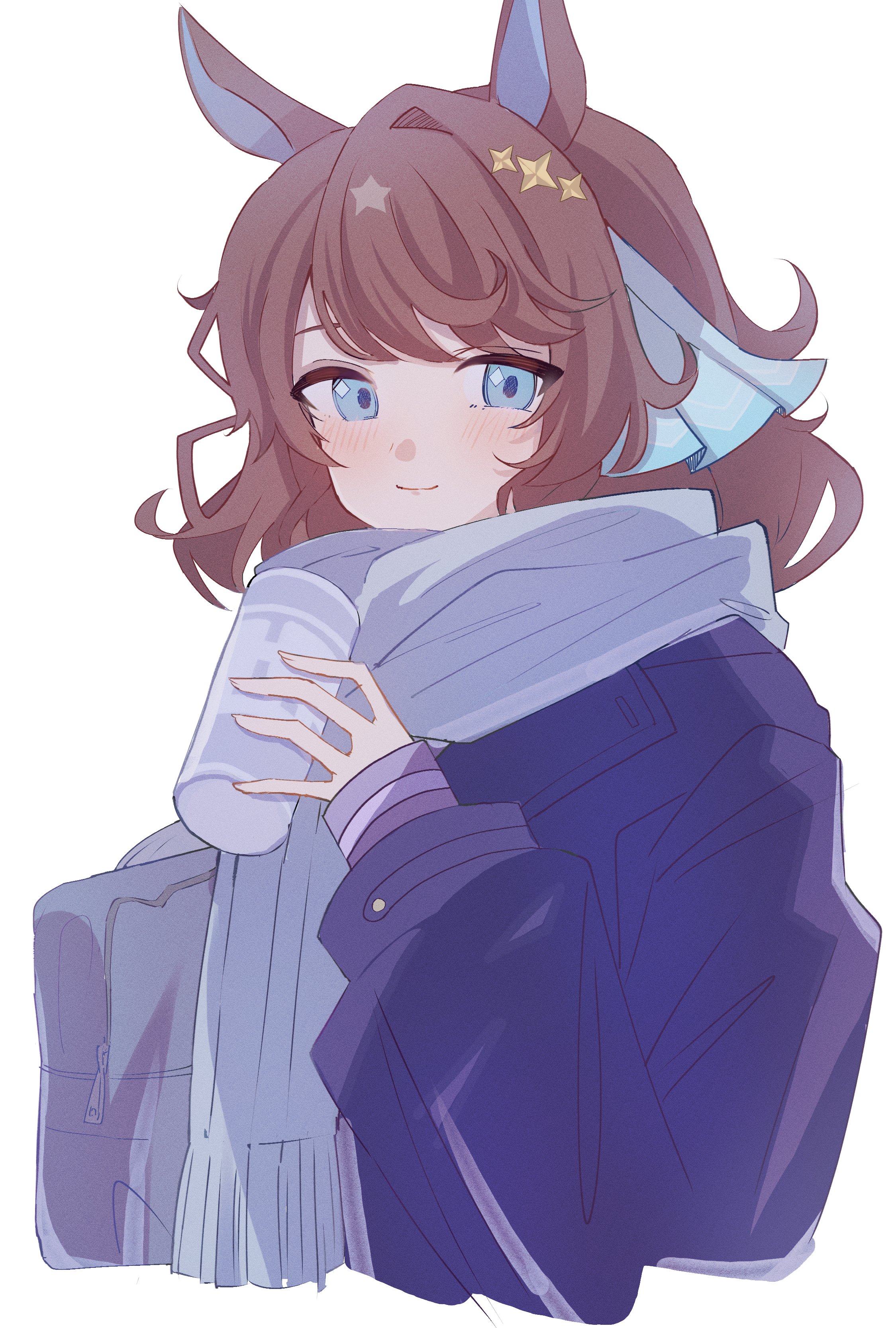 1girl absurdres animal_ears bag blue_coat blue_eyes brown_hair can coat daring_tact_(umamusume) hair_ornament highres holding holding_can horse_ears horse_girl looking_at_viewer medium_hair pocopocomaru810 scarf school_bag smile solo umamusume