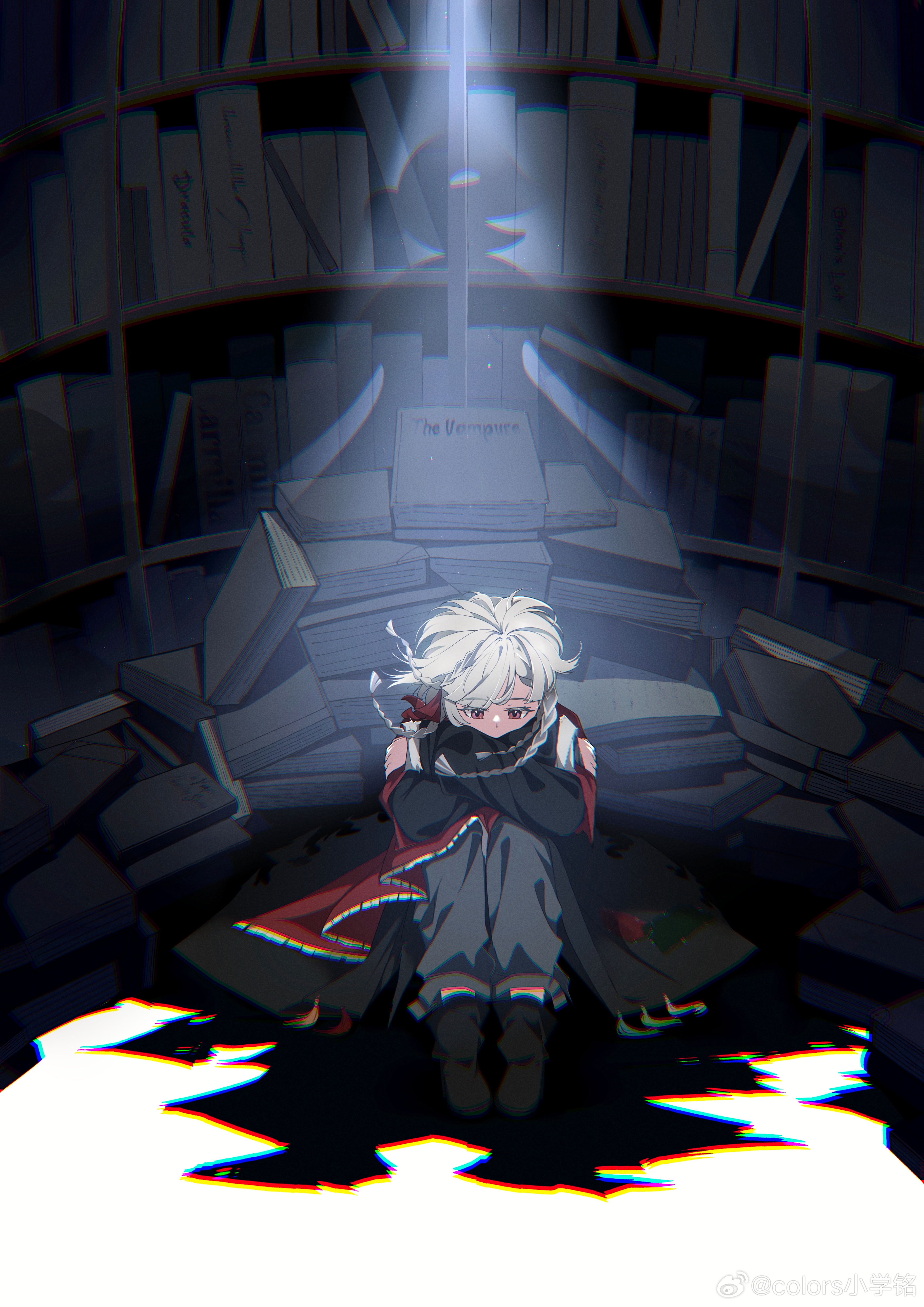1girl absurdres black_boots black_coat book book_stack bookshelf boots chromatic_aberration coat crossed_arms dark different_shadow floating_hair full_body grey_pants highres knees_to_chest looking_down medium_hair on_ground pants quad_braids red_eyes reverse:1999 rubuska sitting solo spotlight watermark weibo_watermark white_hair xiaoxueming