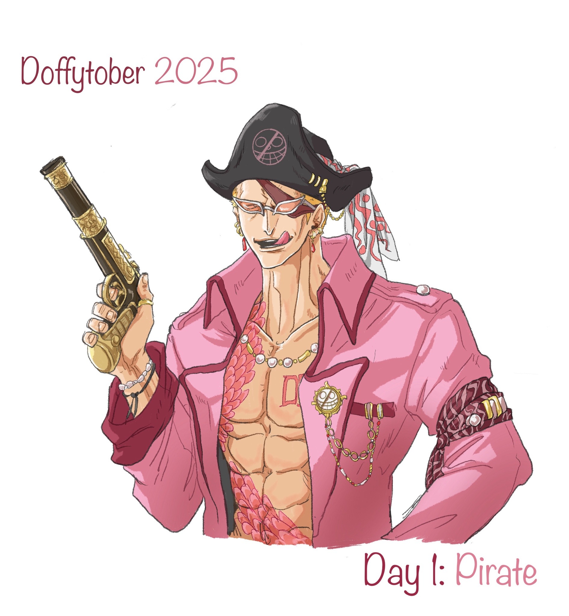 1boy abs armband blonde_hair bracelet chest_tattoo donquixote_doflamingo earrings english_text eyepatch gun hat highres holding holding_gun holding_weapon inktober jacket jewelry male_focus multiple_bracelets muscular muscular_male necklace one_piece open_clothes open_jacket pink_jacket pirate_costume pirate_hat red_armband short_hair smile stomach_tattoo sunglasses tattoo tongue tongue_out tuquidflamingo upper_body weapon white_background