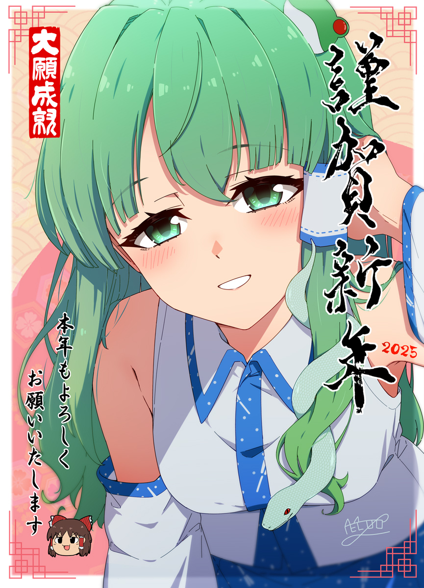 1girl 2025 bare_shoulders border breasts chibi chibi_inset collared_shirt commentary_request detached_sleeves frog_hair_ornament green_eyes green_hair grin hair_ornament hair_tubes hakurei_reimu hand_in_own_hair highres kochiya_sanae leaning_forward light_blush long_hair looking_at_viewer medium_breasts necono_(nekonosora1207) new_year outside_border shirt signature single_hair_tube sleeveless sleeveless_shirt smile snake_hair_ornament touhou translation_request upper_body white_border white_shirt white_sleeves