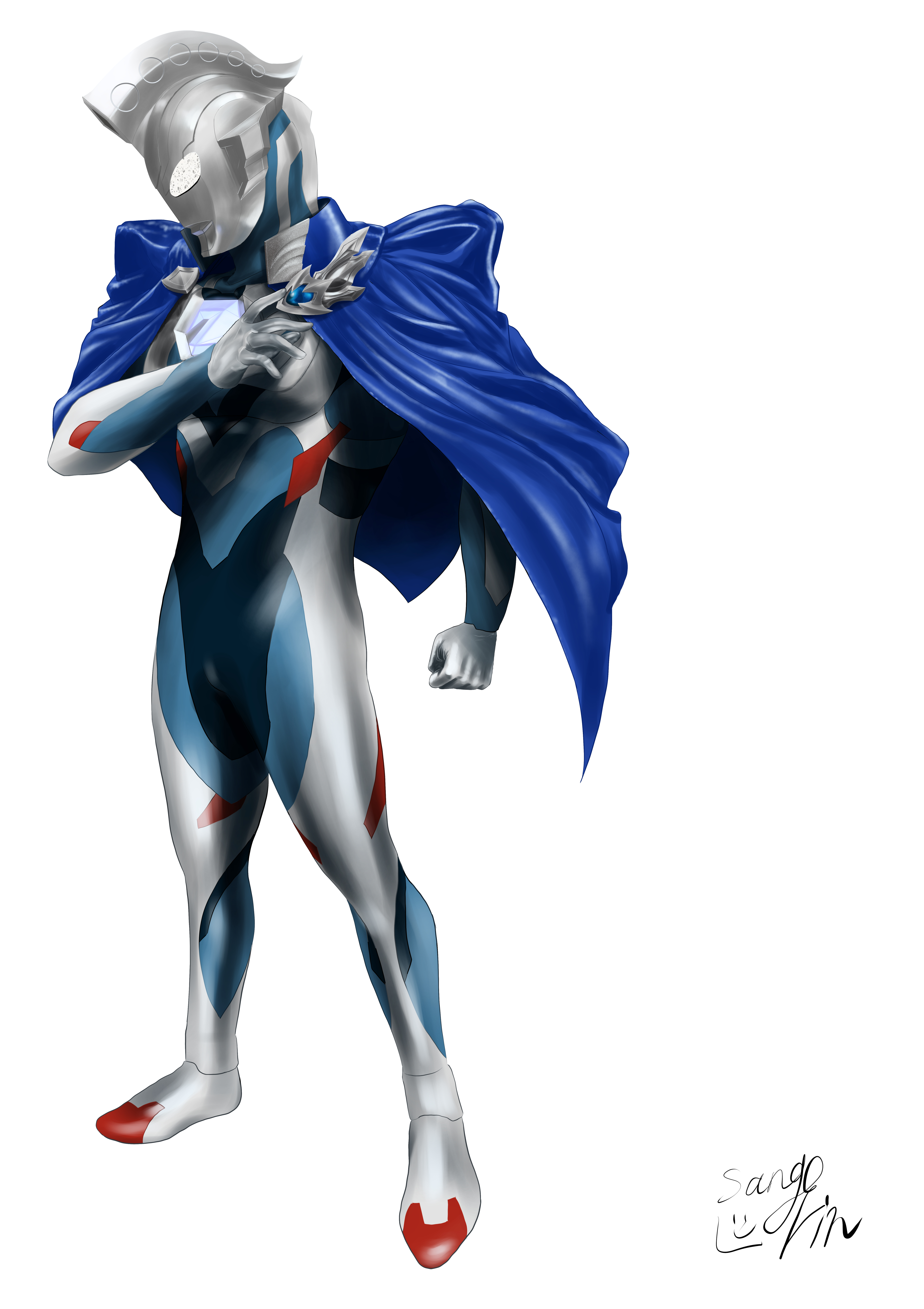 1boy absurdres alien armor artist_name black_skin blue_cape blue_skin breastplate brooch cape clenched_hand color_timer colored_skin commentary compound_eyes dorsal_fin full_body giant giant_male glowing glowing_eyes hand_up highres jewelry legs_apart looking_down male_focus multicolored_skin no_pupils pectorals red_skin shining_gold_montblanc signature silver_skin simple_background solo standing tokusatsu toned toned_male ultra_series ultraman_z ultraman_z_(original) ultraman_z_(series) white_background white_eyes