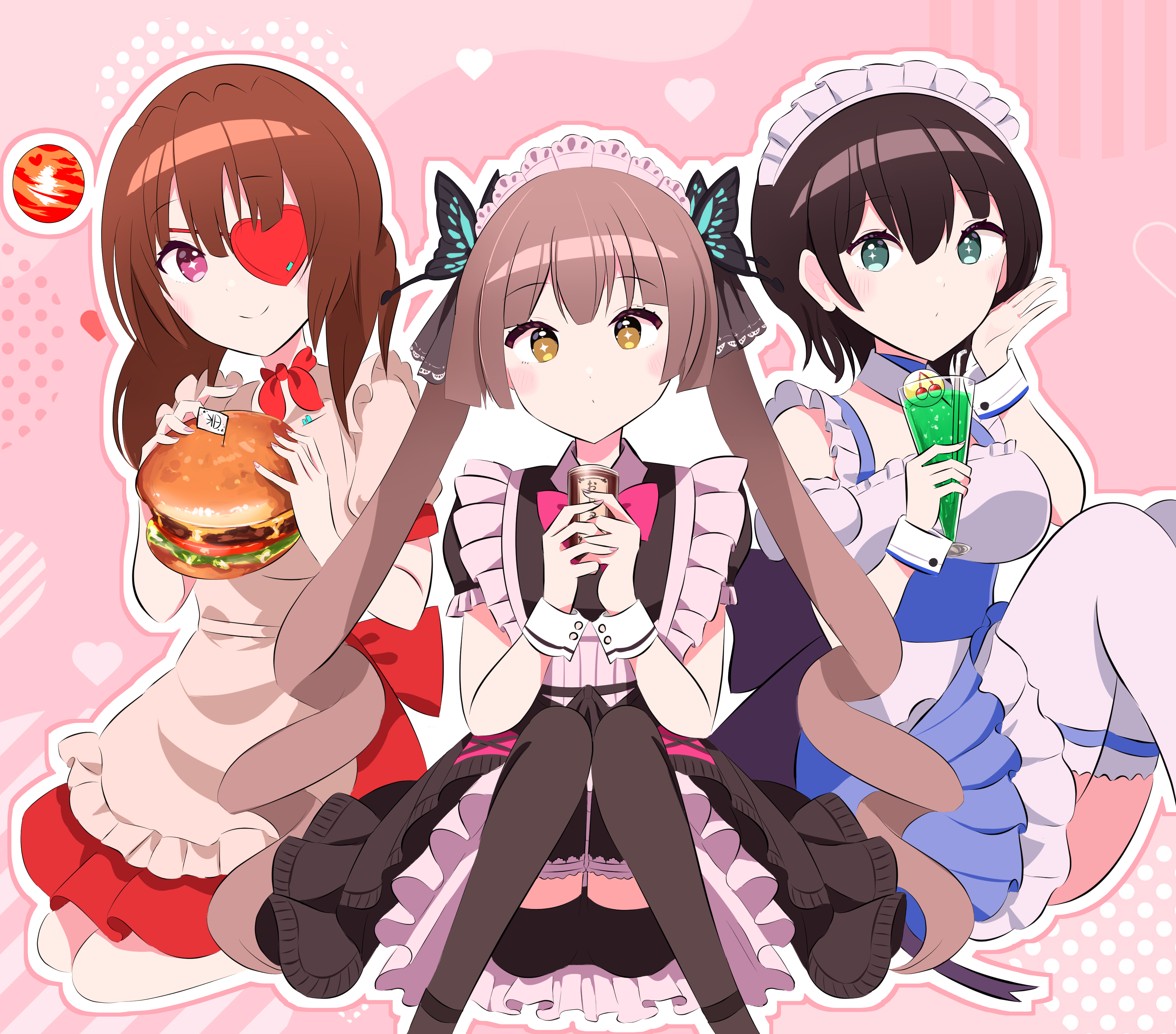 3girls absurdres aoi_erika aoi_erika_(deliverer_of_miracle) apron aqua_eyes atnamiret black_dress black_hair black_thighhighs blue_dress blush bow breasts brown_hair burger butterfly_hair_ornament can closed_mouth cup dot_mouth dress drink drink_can drinking_straw eyepatch food french_fries frilled_apron frilled_dress frills green_eyes hair_between_eyes hair_ornament heaven_burns_red highres hiiragi_kozue hiiragi_kozue_(hop_step_slip!) holding holding_can holding_drink holding_food ice_cream long_hair looking_at_viewer maid maid_apron maid_headdress multiple_girls ogasahara_hisame ogasahara_hisame_(angelic_genius_swordswoman) one_eye_covered outline pink_background pink_eyes puffy_short_sleeves puffy_sleeves red_bow ribbon short_hair short_sleeves sitting smile soda soda_can symbol-shaped_pupils thighhighs twintails very_long_hair white_outline white_thighhighs wrist_cuffs yellow_eyes