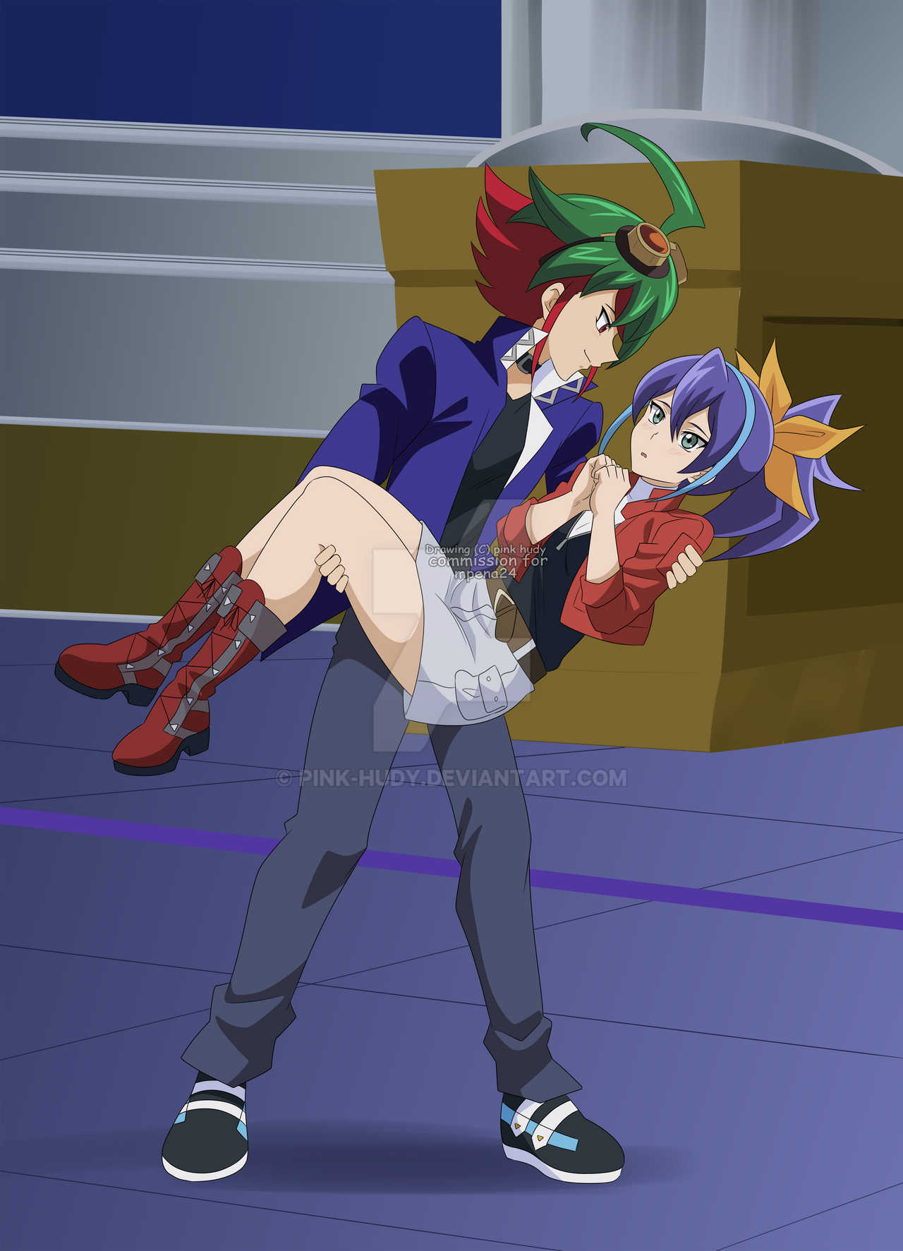 1boy 1girl blue_jacket boots bow carrying carrying_person full_body hair_bow highres jacket looking_at_another pink-hudy ponytail princess_carry purple_hair red_boots sakaki_yuya serena_(yu-gi-oh!) smile watermark yu-gi-oh! yu-gi-oh!_arc-v
