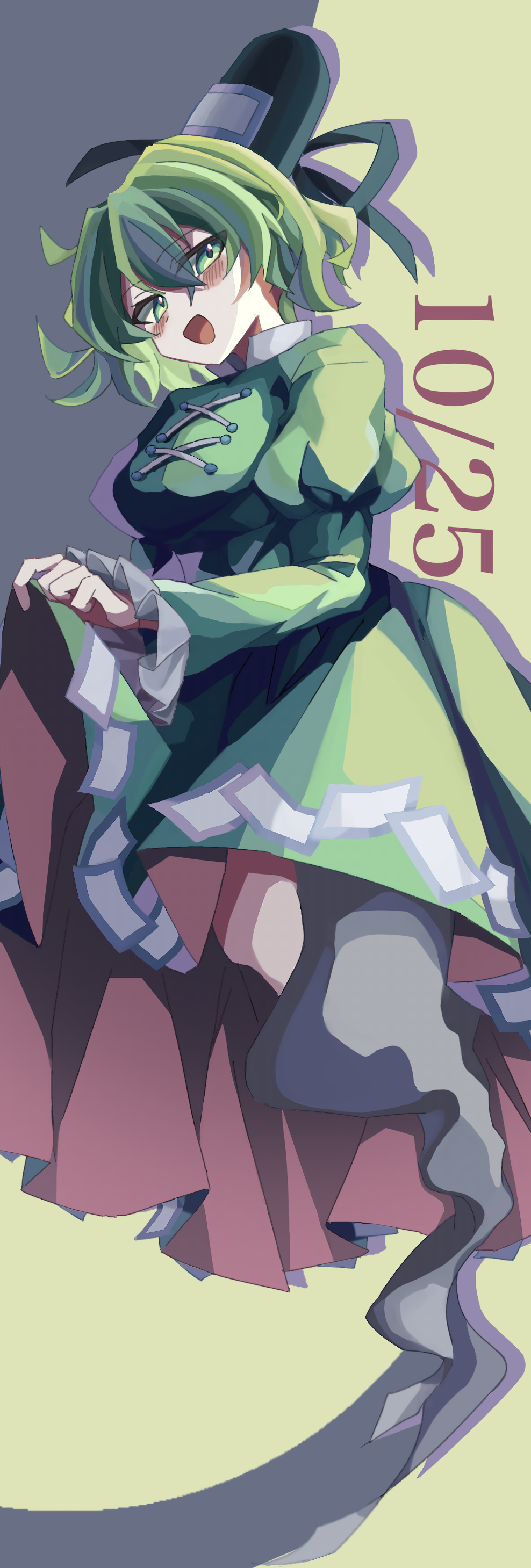 1girl :d absurdres black_hat black_ribbon breasts commentary_request cropped dated dress frills full_body ghost_tail green_background green_dress green_eyes green_hair grey_background hat hat_ribbon highres holding_own_dress large_breasts long_sleeves looking_at_viewer ofuda ofuda_on_clothes open_mouth puffy_long_sleeves puffy_sleeves ribbon short_hair smile soga_no_tojiko solo tate_eboshi touhou two-tone_background xing_mao_yin_(ksyd4458)