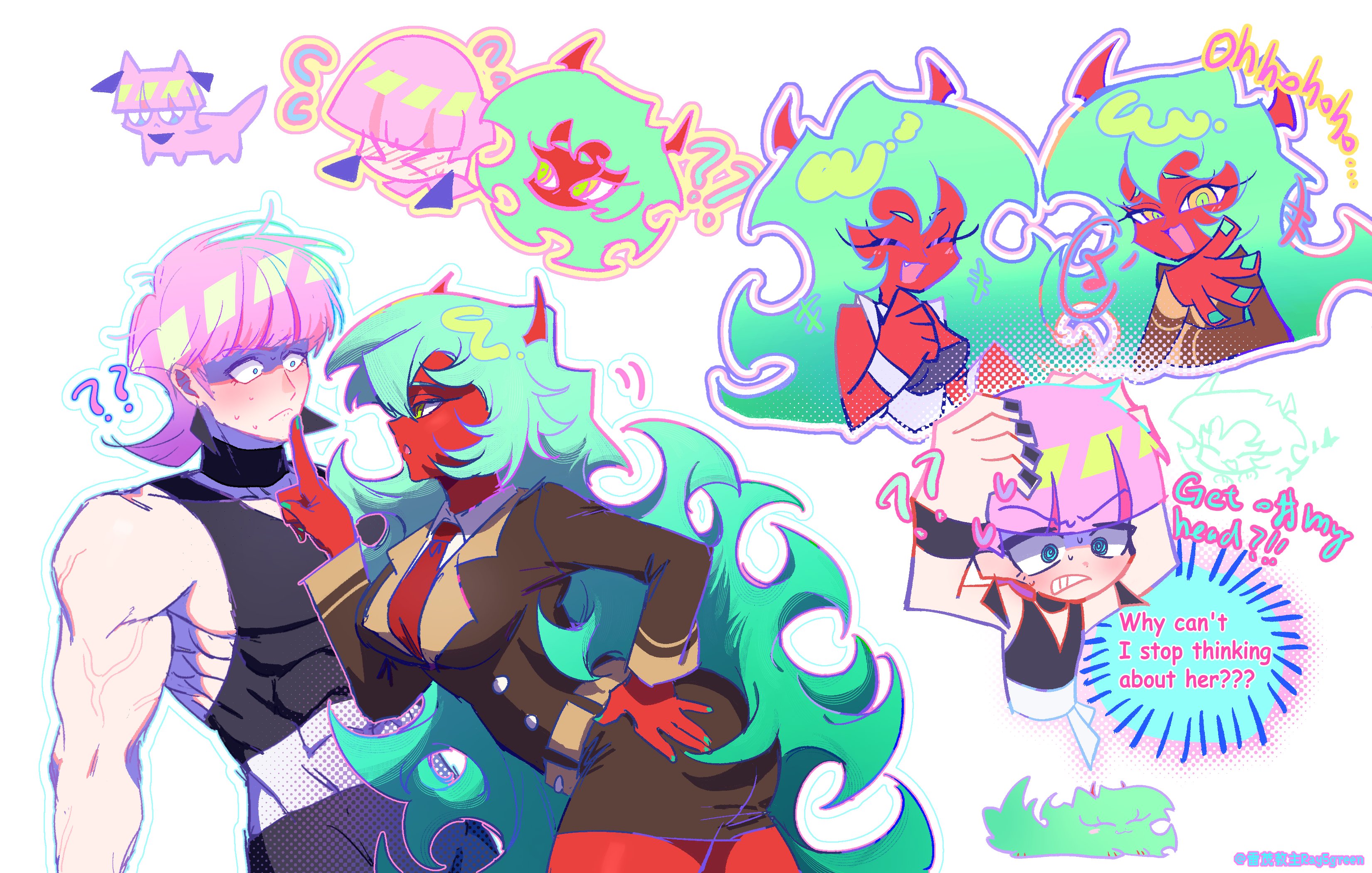 1boy 1girl absurdres black_jumpsuit blue_eyes blush colored_skin demon_girl demon_horns face-to-face green_eyes green_hair highres horns jumpsuit muscular muscular_male panty_&_stocking_with_garterbelt pink_hair polyurethane_(psg) ray5green red_skin scanty_(psg) school_uniform
