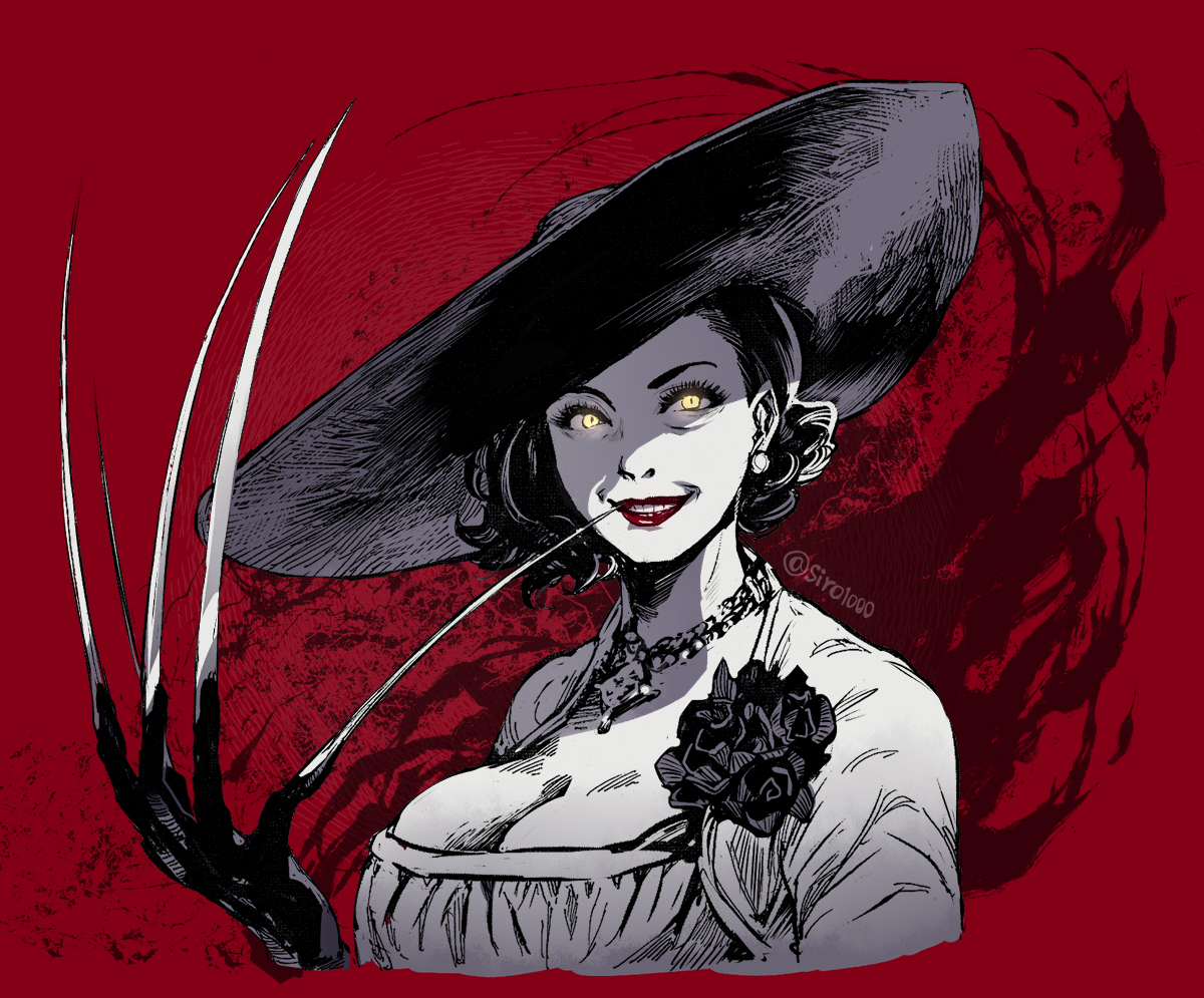 1girl alcina_dimitrescu black_hair black_hat breasts claws cleavage dress dress_flower earrings flower hat jacket jewelry large_breasts necklace parted_lips pearl_earrings red_background red_lips resident_evil resident_evil_village shiroton_(kazamineko) short_hair skindentation smile solo sun_hat upper_body wavy_hair white_dress white_jacket wide_brim yellow_eyes