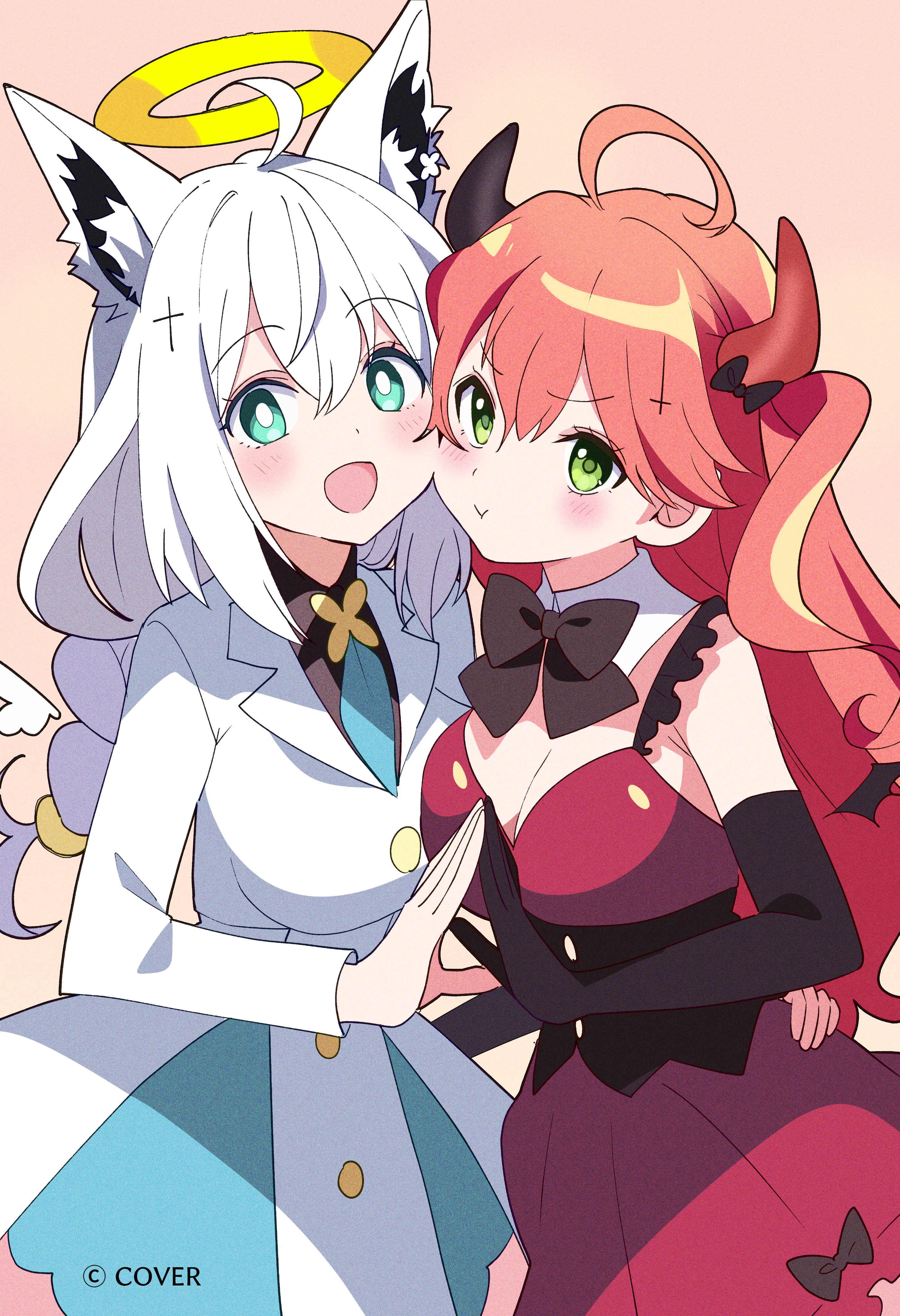 2girls :d absurdres ahoge angel_wings animal_ear_piercing animal_ears aqua_eyes aqua_neckerchief black_bow black_bowtie black_corset black_gloves black_shirt bow bowtie braid braided_ponytail breasts bright_pupils cleavage collared_shirt commentary_request copyright_name corset cosplay demon_horns demon_wings detached_collar detached_wings double-parted_bangs dress elbow_gloves fox_ears fox_girl gloves green_eyes hair_between_eyes halo hand_on_another's_hip highres hololive horns hutaba_haru jacket large_breasts long_hair looking_at_viewer low_ponytail mini_wings multiple_girls neckerchief official_art one_side_up open_mouth pink_background pink_hair ponytail pouch red_dress sakura_miko shirakami_fubuki shirt simple_background skirt smile tententengokujigokugoku_(aiobahn) tententengokujigokugoku_(cosplay) virtual_youtuber white_dress white_hair white_jacket white_pupils white_skirt wings